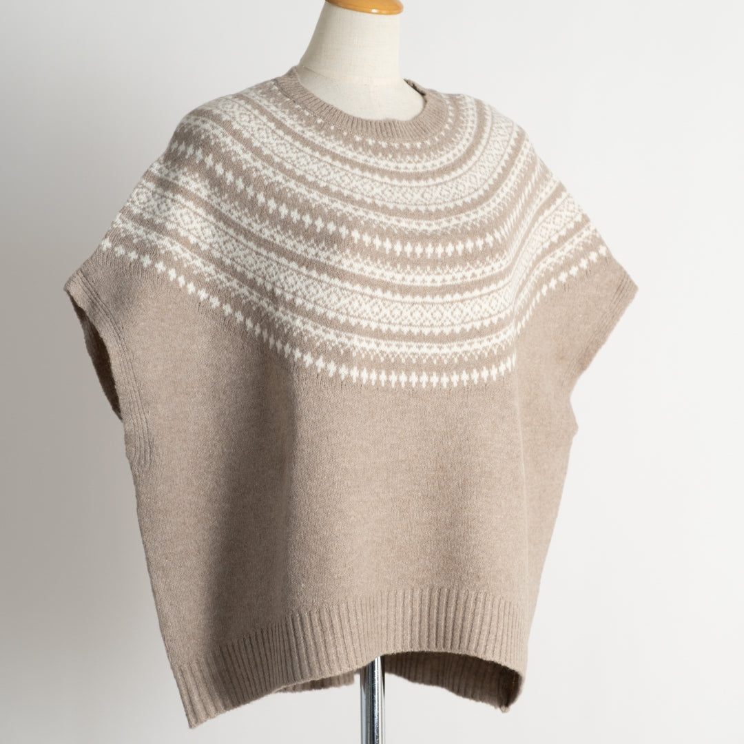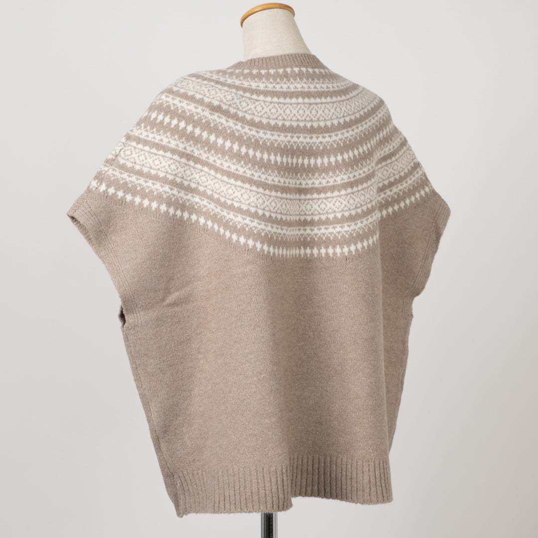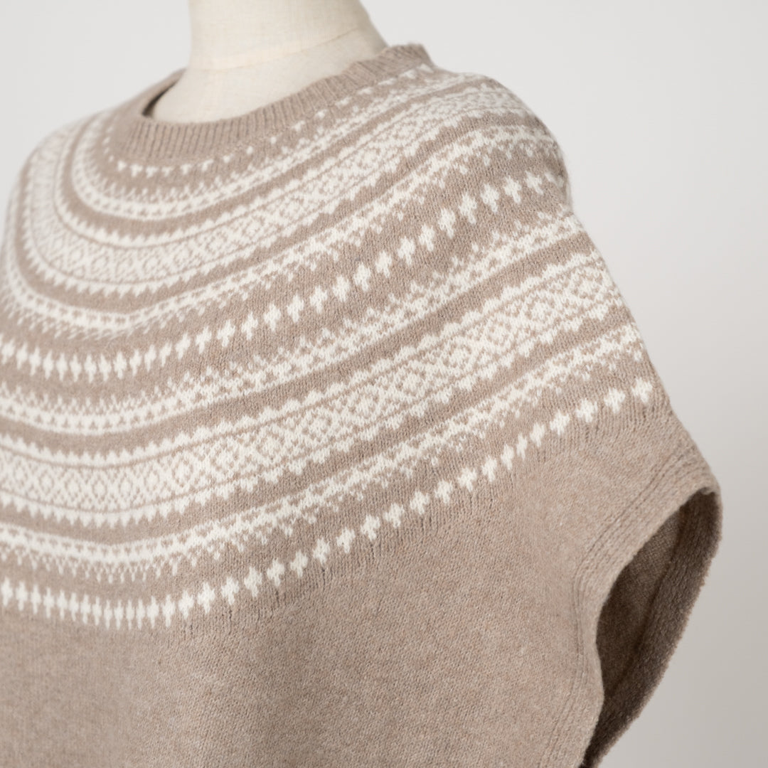 幾何学的な求心柄が視線を集める、洗練されたベスト。シンプルなシルエットに、動きのあるパターンが奥行きと立体感をプラス。上質素材と緻密な配置で、カジュアルからセミフォーマルまで対応する汎用性の高い一着です。