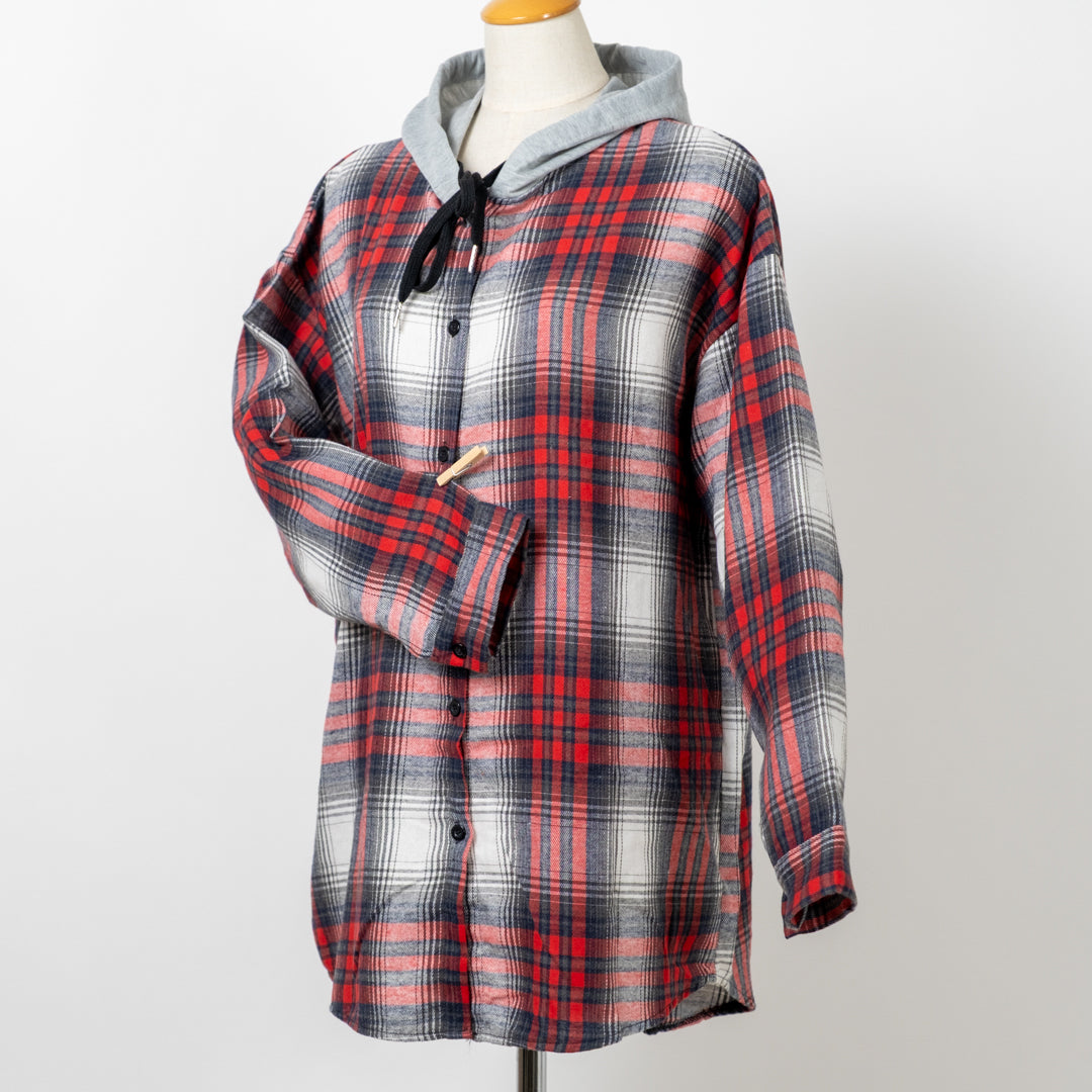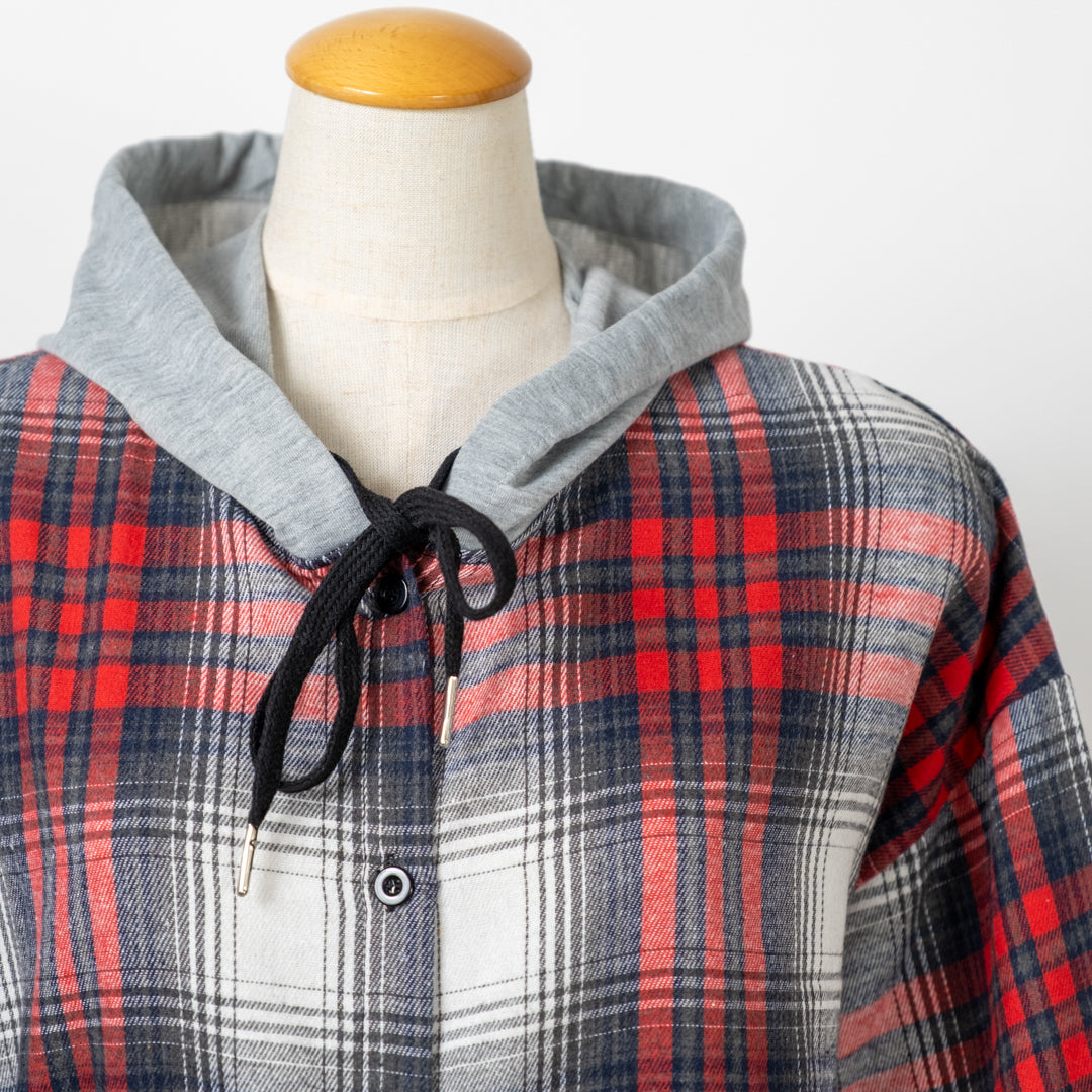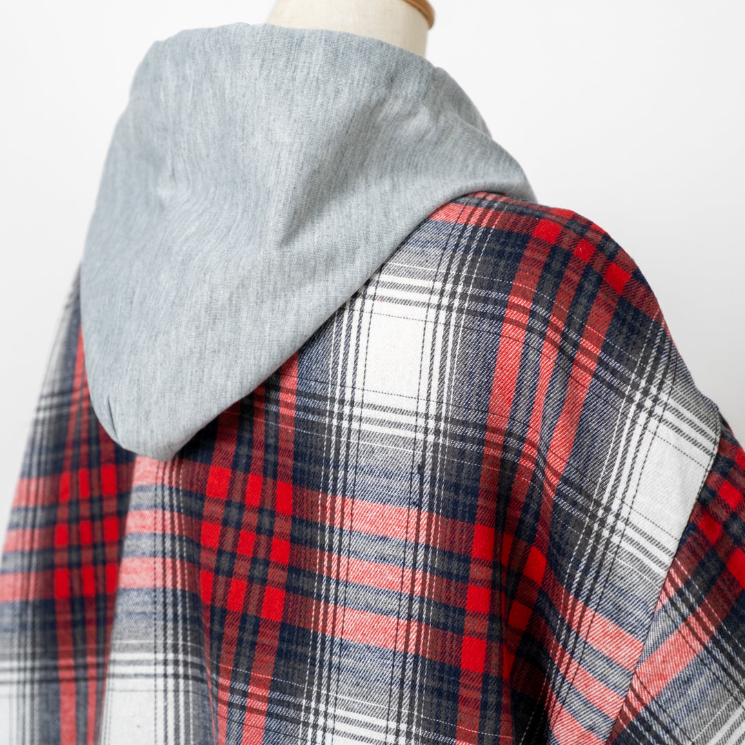 柔らかな肌触りと、一日中着ていても疲れない快適な着用感を追求した素材を使用。長袖デザインでありながら軽やかで、気温の変化が激しい時期の体温調節に最適です。最大の魅力は、デザイン性と機能性を兼ね備えたフード付きスタイル。急な小雨や肌寒さに対応できるだけでなく、顔周りに立体感と抜け感を演出し、小顔効果も期待できます。