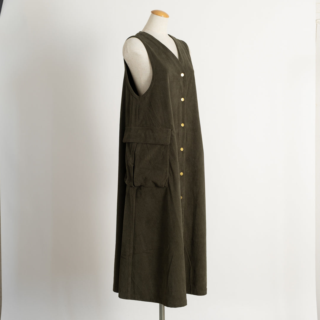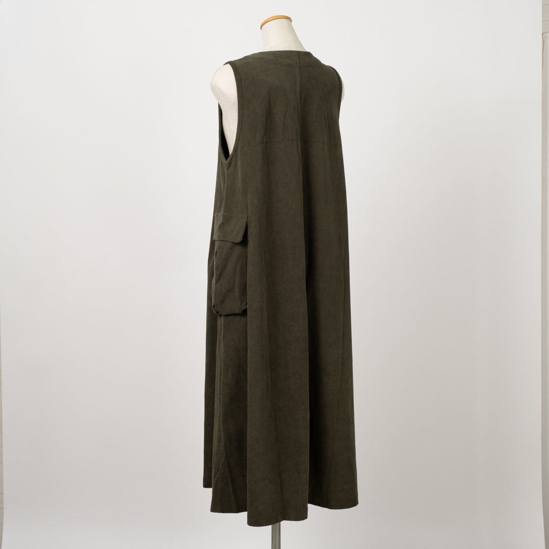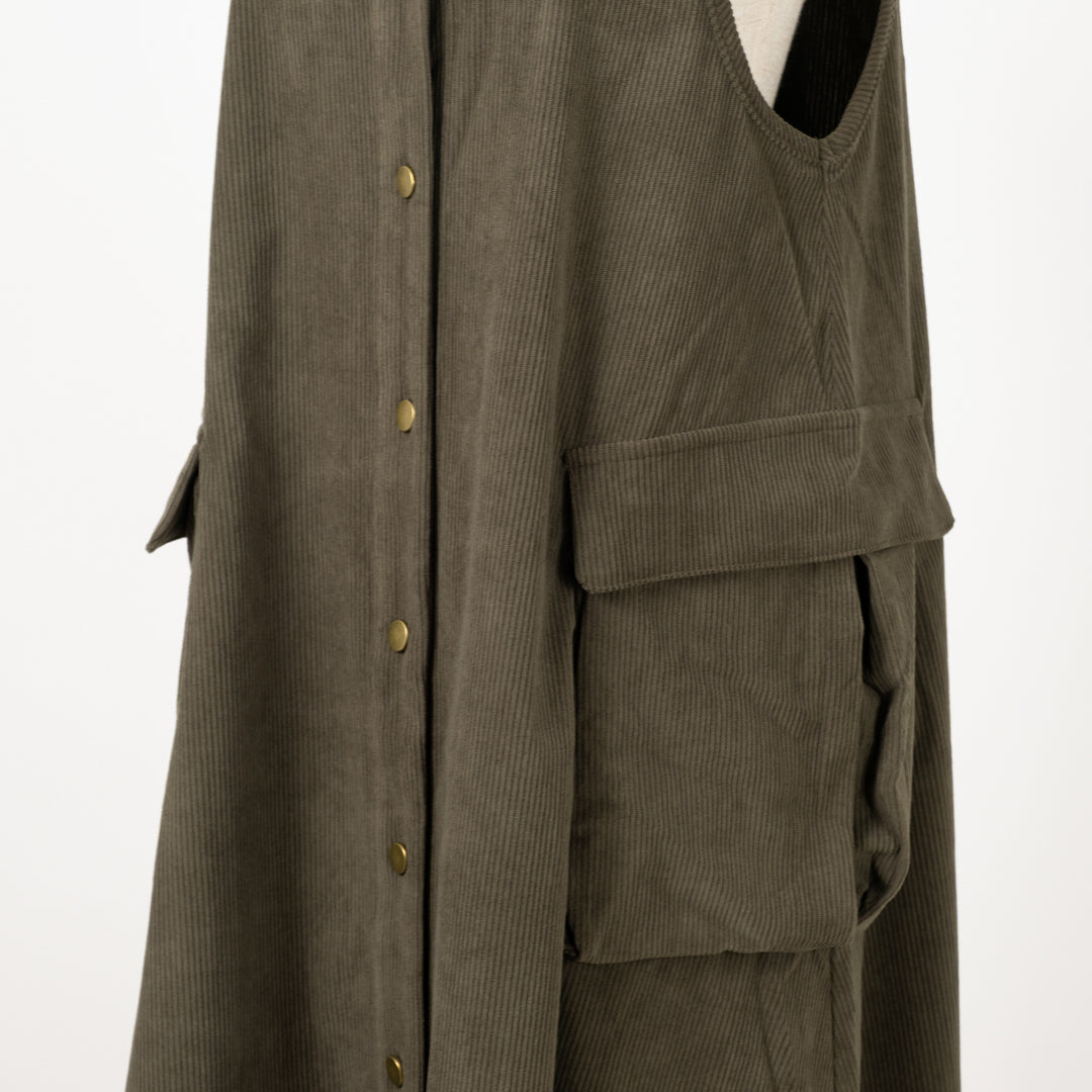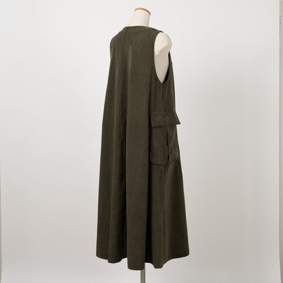 季節感漂うAラインジャンバースカート。温かみのある風合いが魅力。女性らしいシルエットで体型カバーしつつ、大きなポケットで実用性も抜群です。ロングベストとしてのアレンジも◎幅広く対応する着回し力の高い一枚。