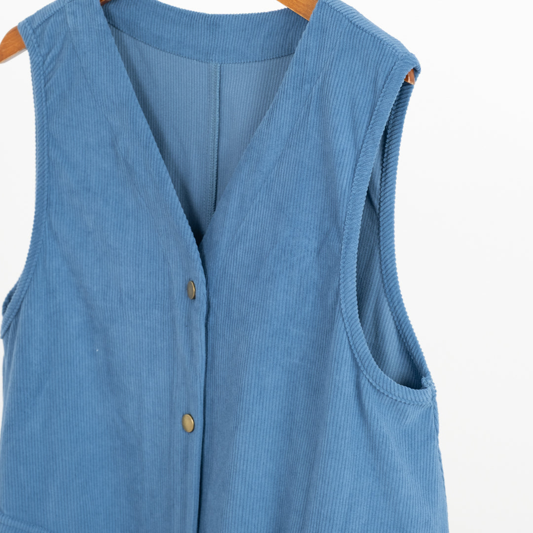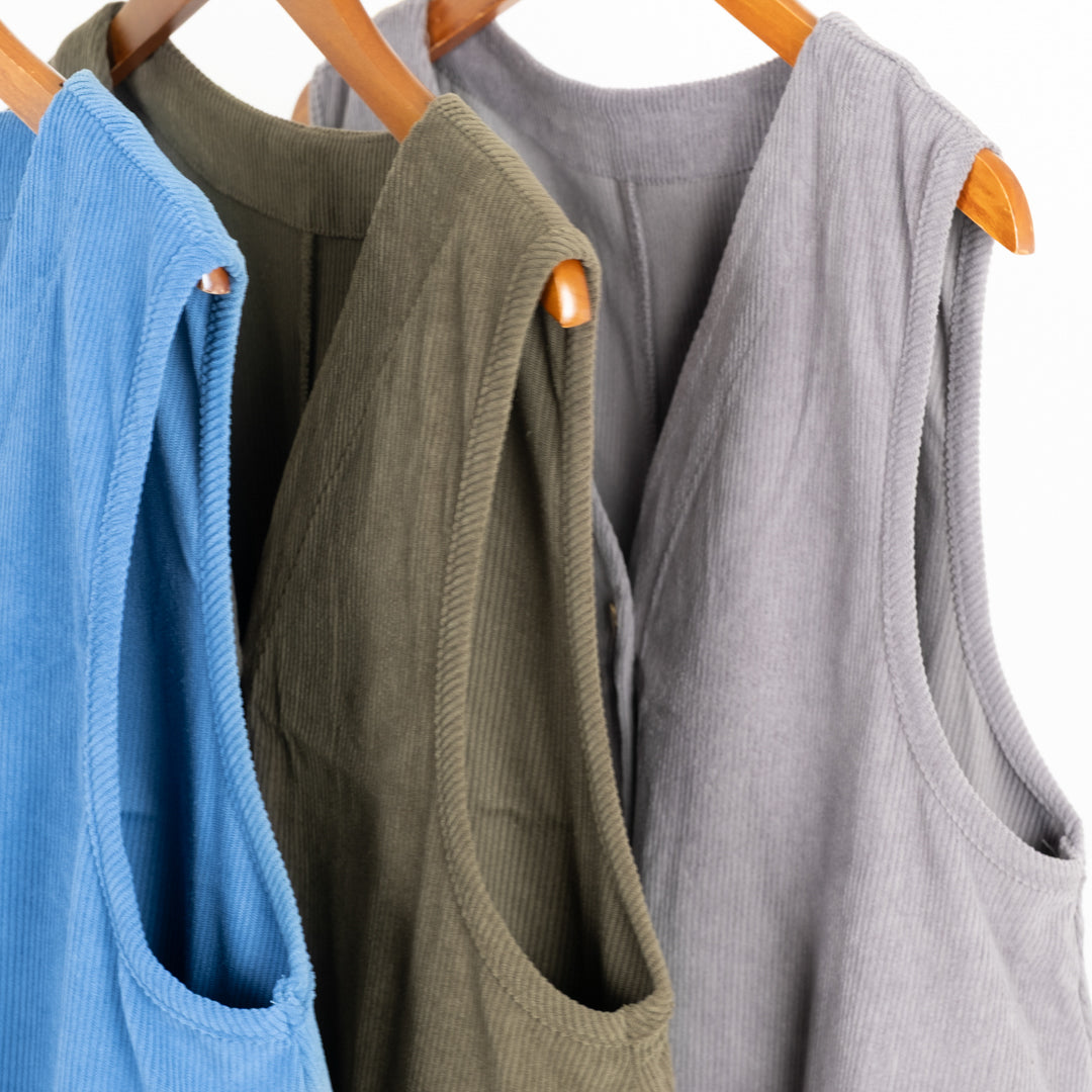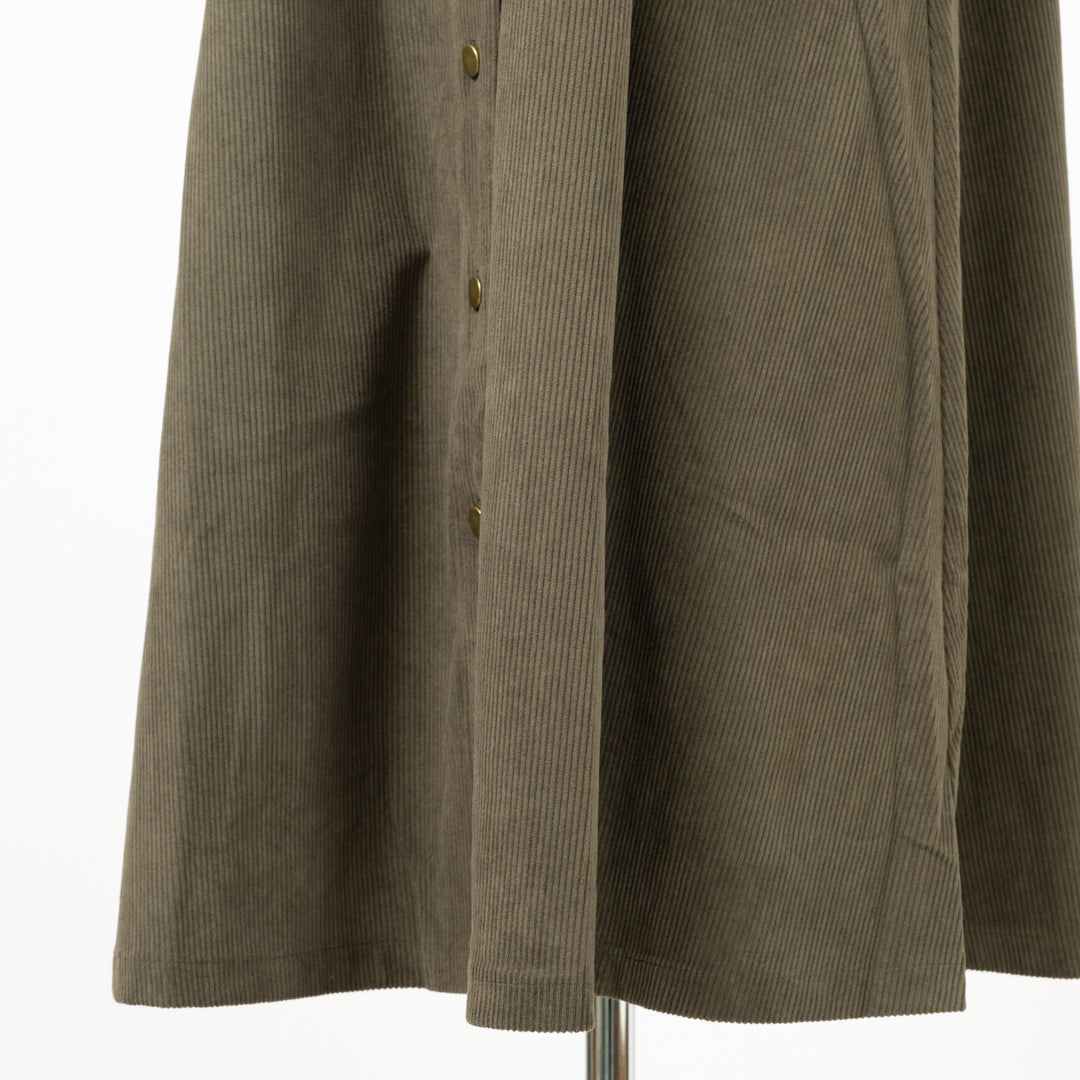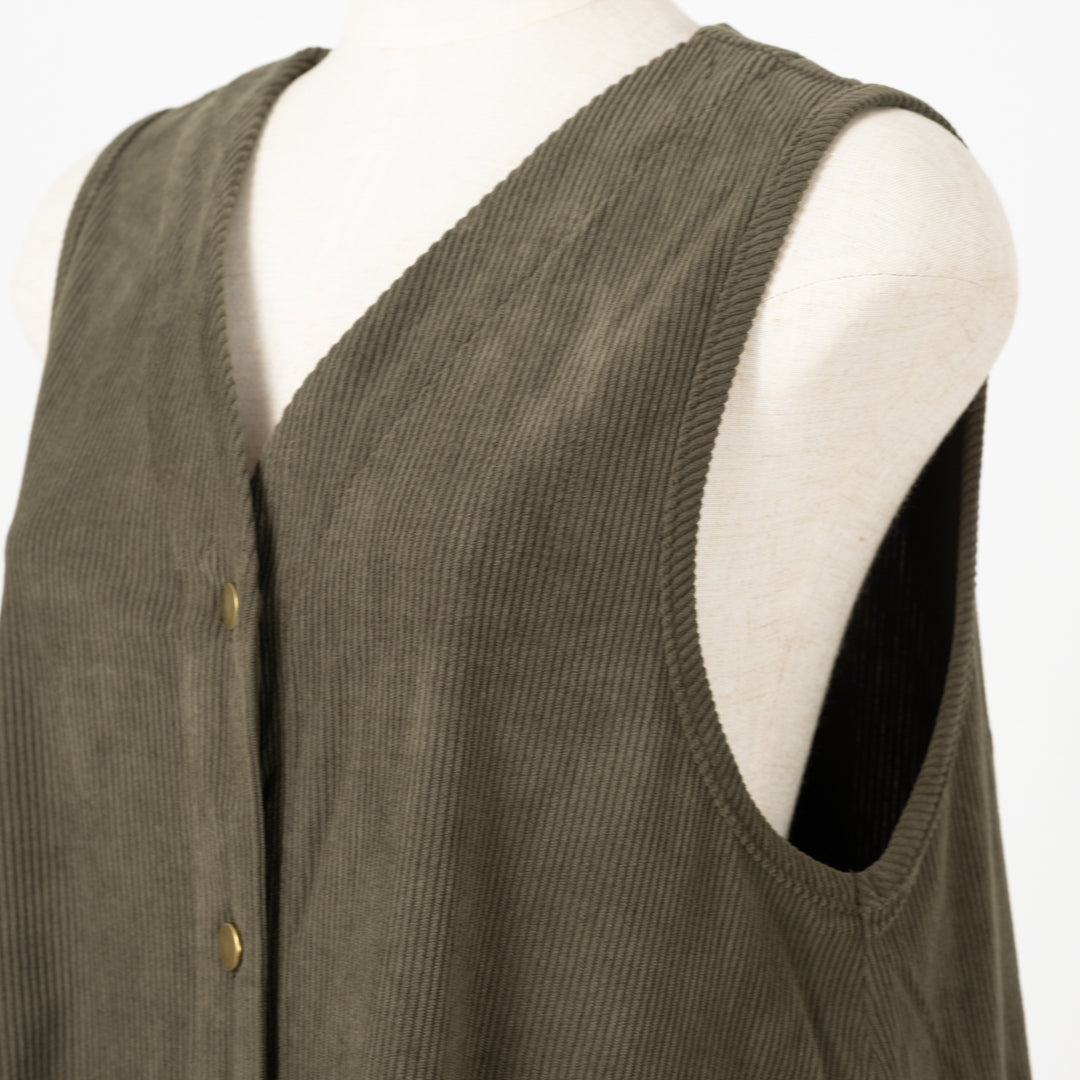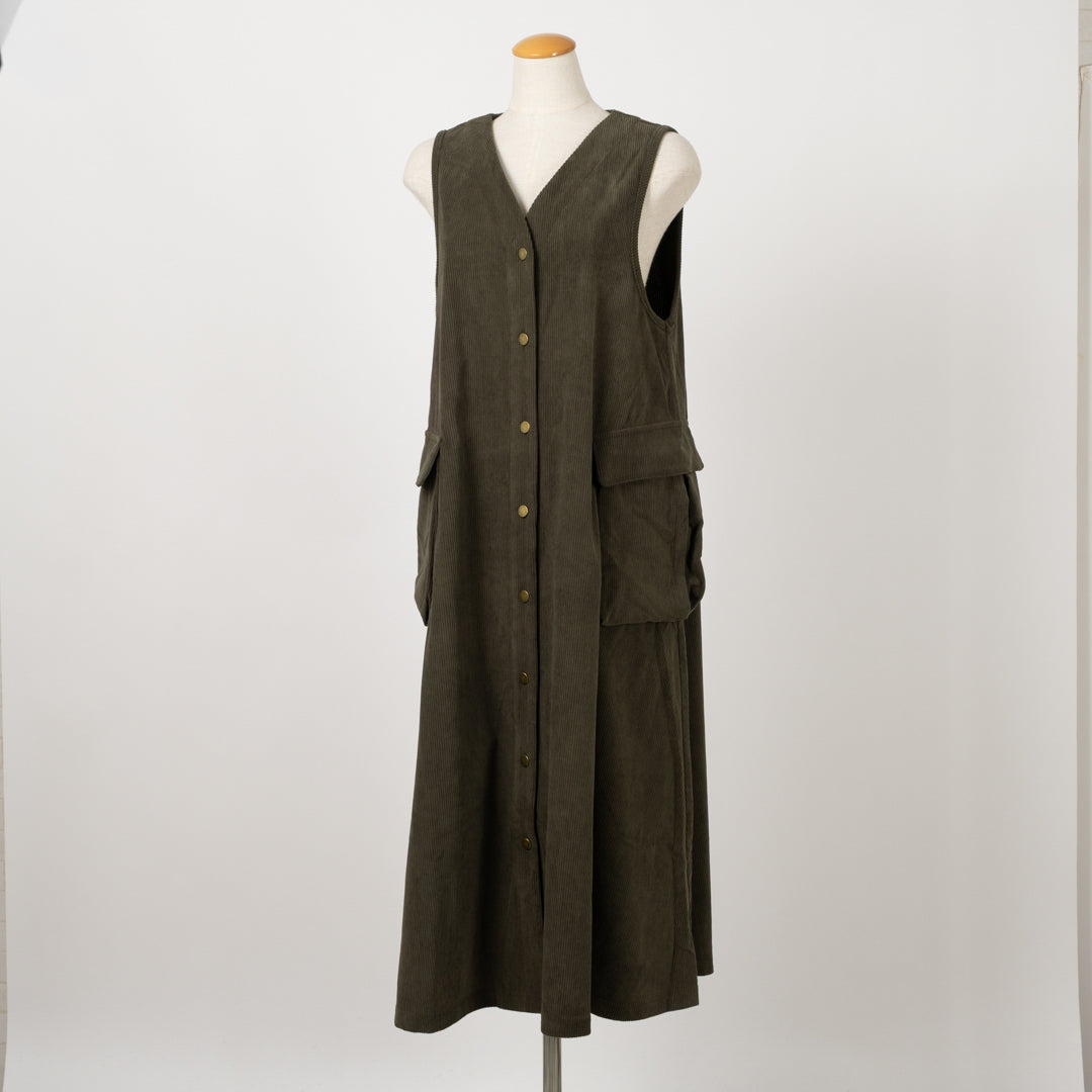 季節感漂うAラインジャンバースカート。温かみのある風合いが魅力。女性らしいシルエットで体型カバーしつつ、大きなポケットで実用性も抜群です。ロングベストとしてのアレンジも◎幅広く対応する着回し力の高い一枚。