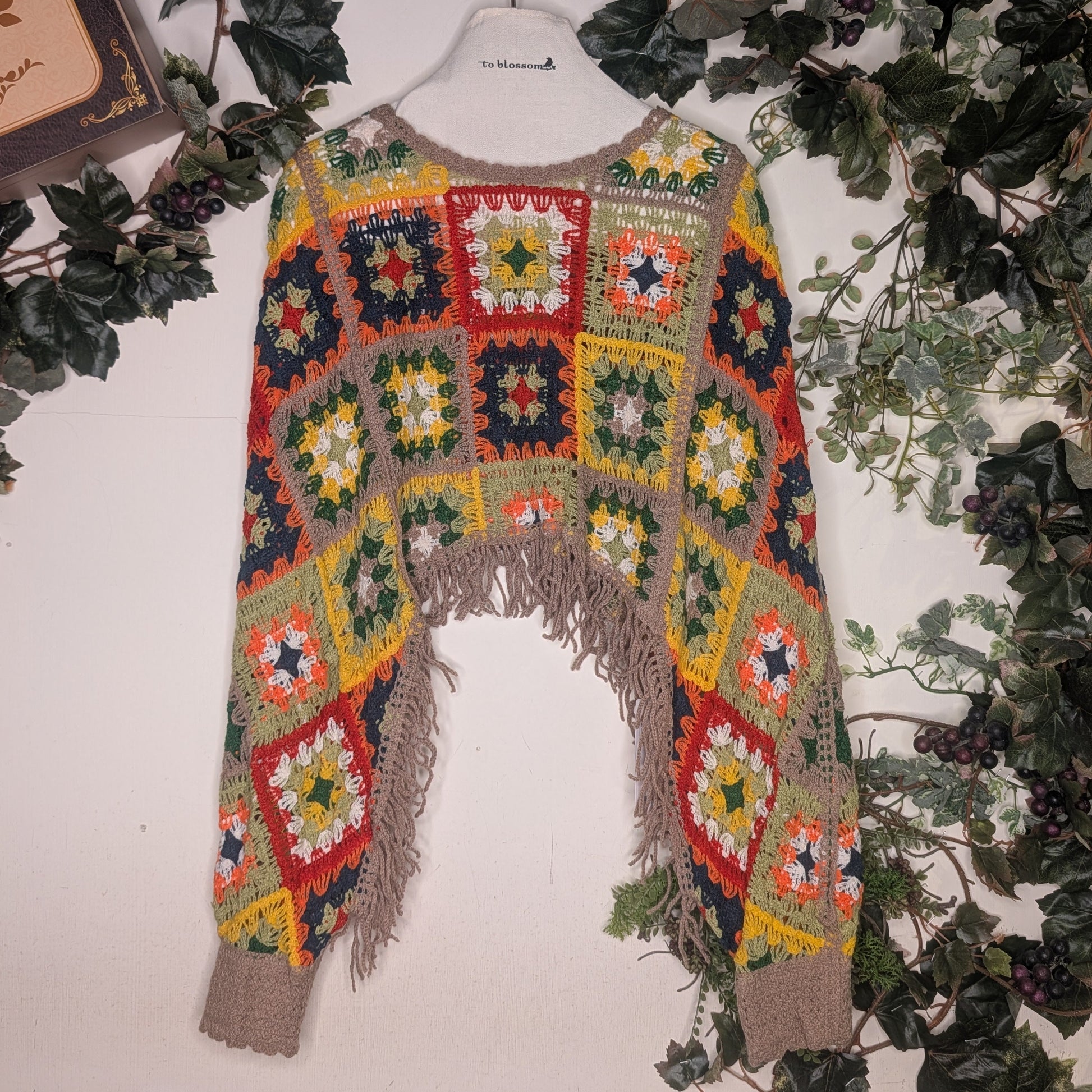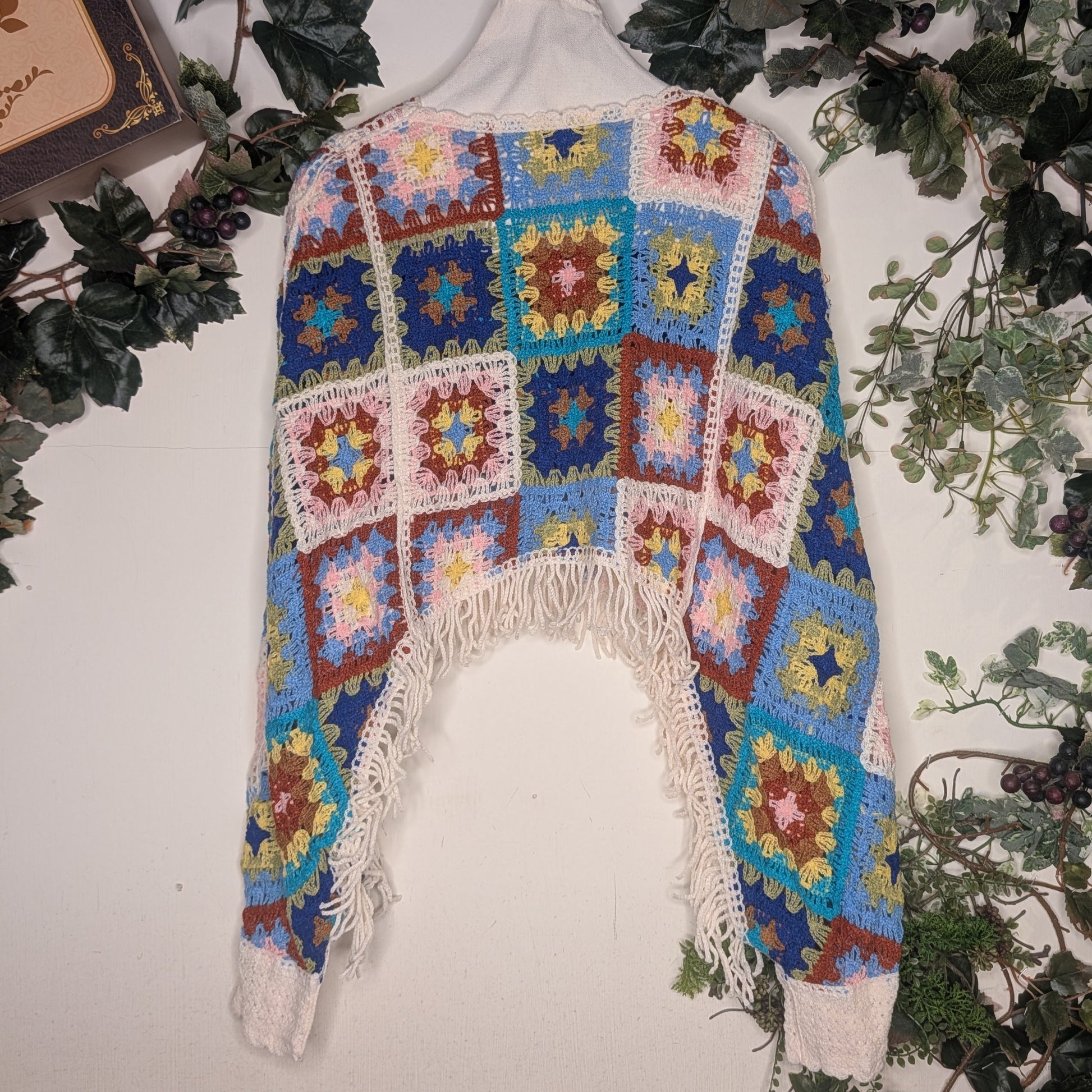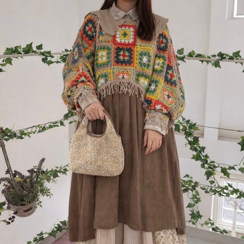 四角く編んだクロシェ編みのパーツを繋ぎ合わせた個性的なデザイン。カラフルな色合いが表情豊かに仕上がり、手首を通せるアームホール付きで、レイヤリングも自由自在。ヴィンテージの魅力と現代的なセンスが融合した、着る人の個性を引き出す一枚です。