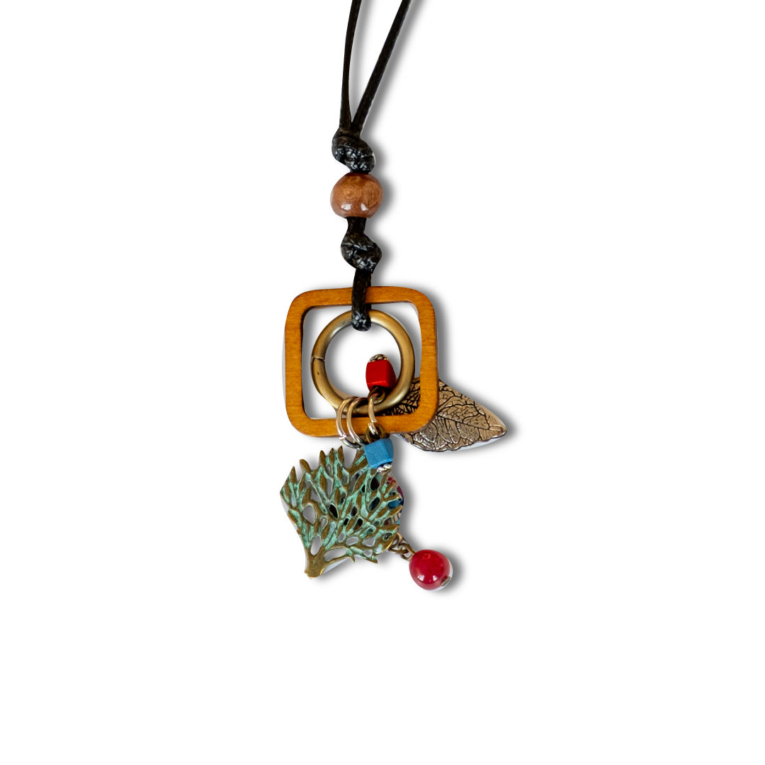 深い森のワンシーンを切り取ったような、アンティーク調のネックレスです。羽を休める小鳥、どっしりと根を張る樹木、そして軽やかに揺れる一枚の葉。3つチャームが胸元で重なり合い、動くたびに繊細な表情を見せてくれます。