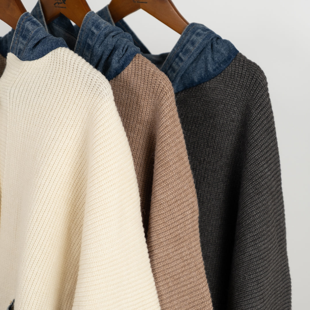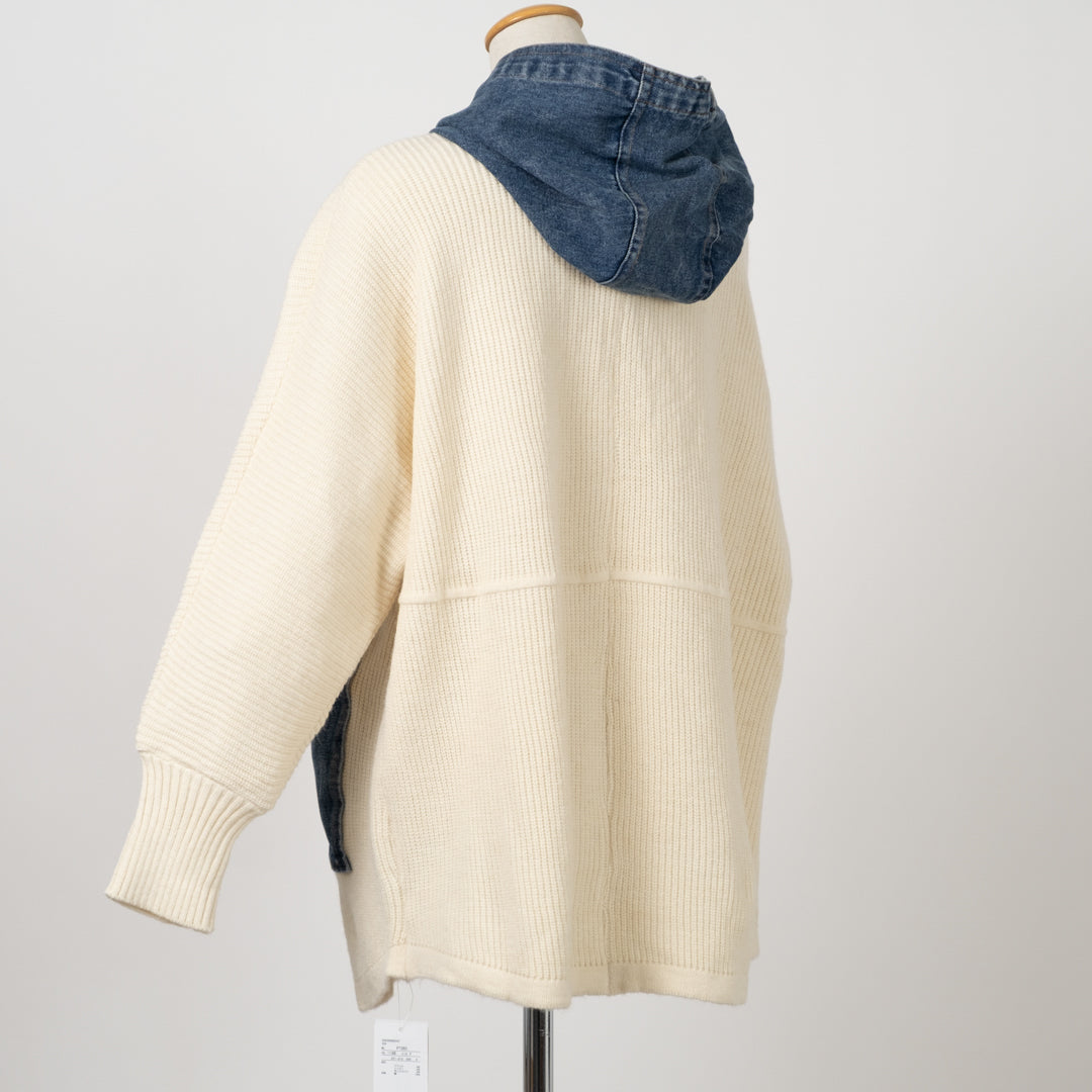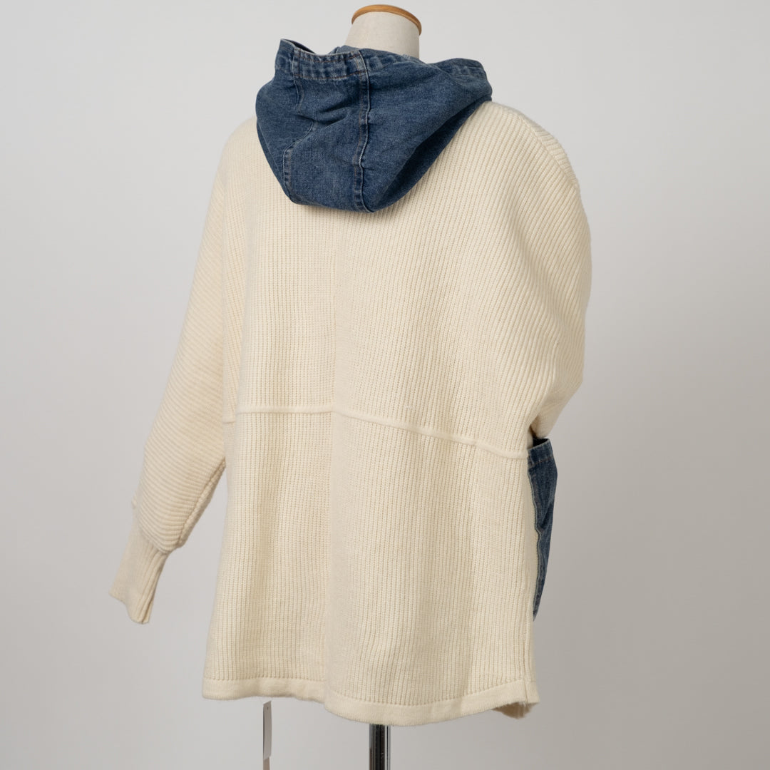 ざっくり編みと異素材デニムパッチが目を引く主役級アイテム。カジュアルながら洗練されたヴィンテージムードを演出。前開きで羽織りやすく、秋冬の重ね着やアクセントに最適。個性的なディテールで差をつけるパッチポケットニットです。