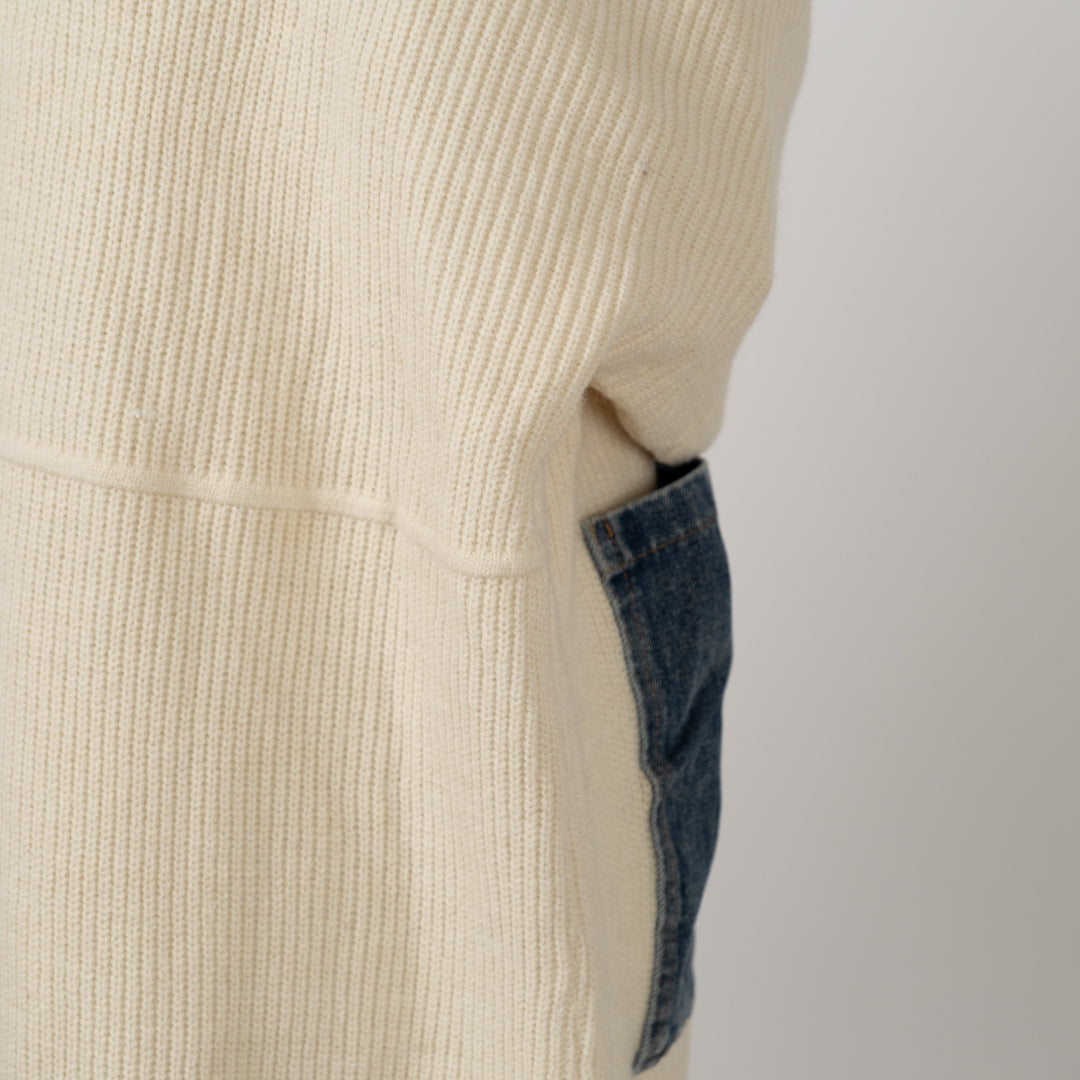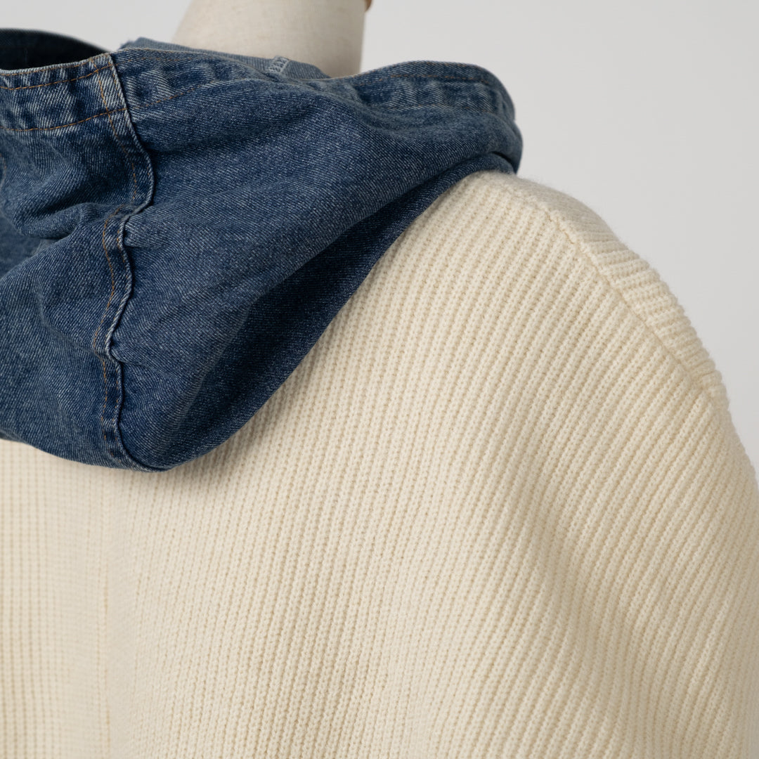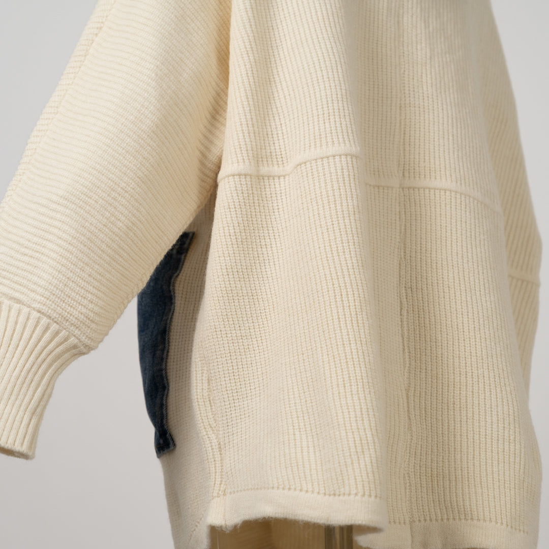 ざっくり編みと異素材デニムパッチが目を引く主役級アイテム。カジュアルながら洗練されたヴィンテージムードを演出。前開きで羽織りやすく、秋冬の重ね着やアクセントに最適。個性的なディテールで差をつけるパッチポケットニットです。