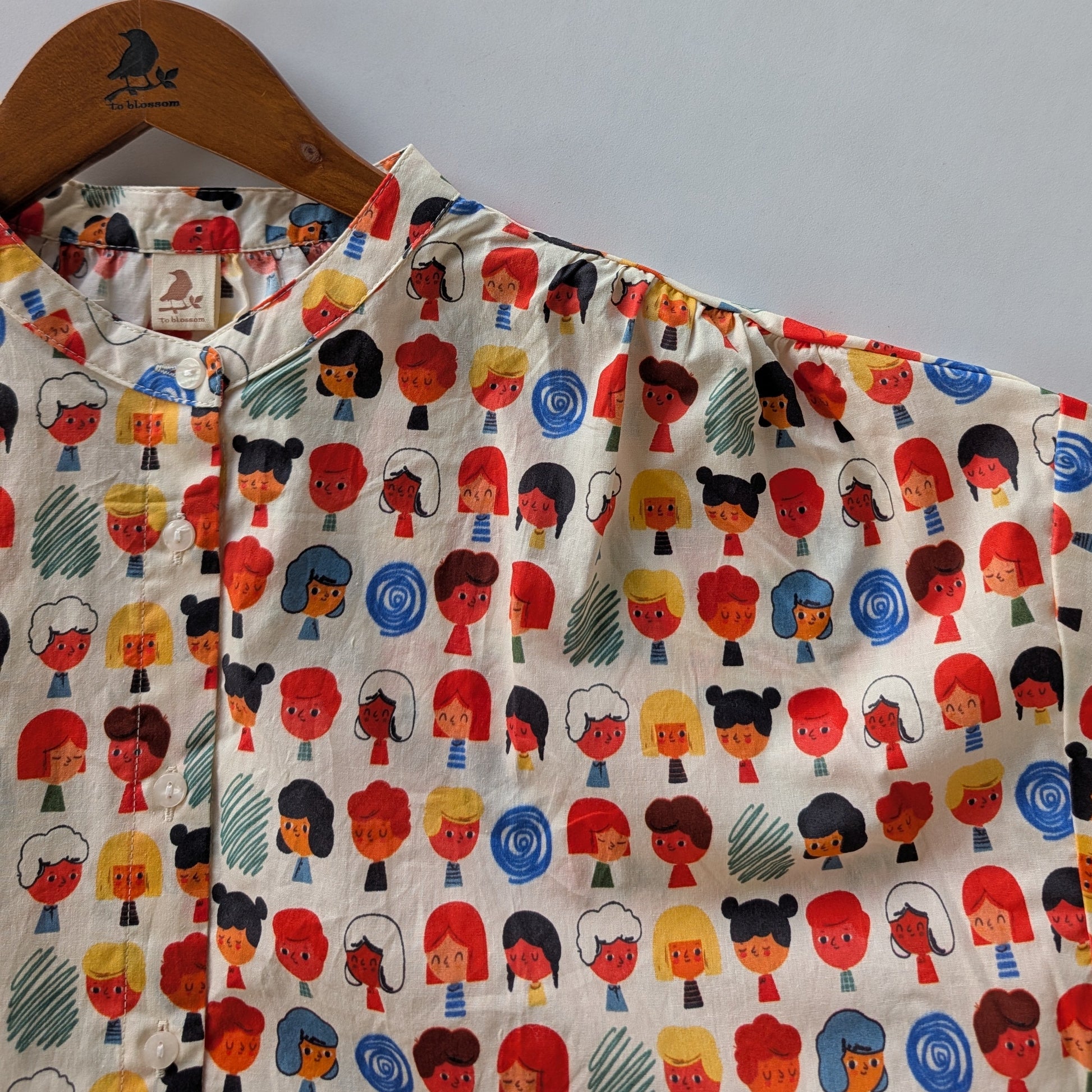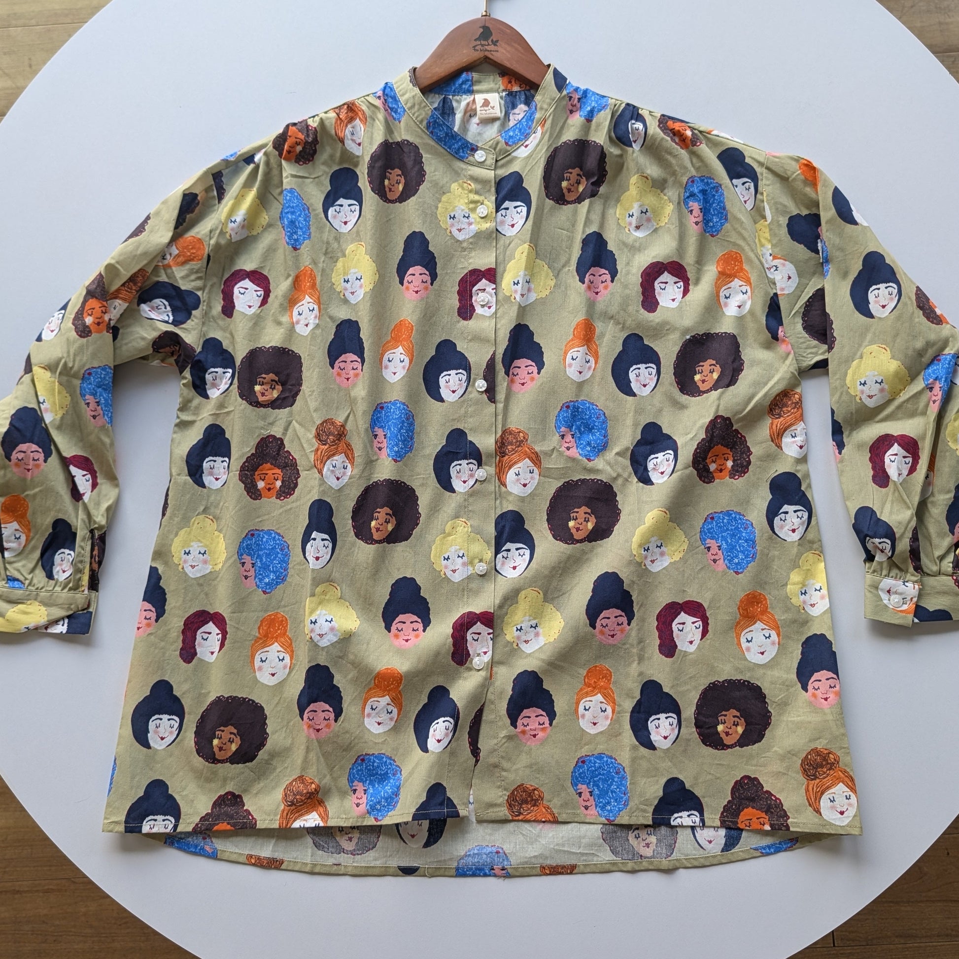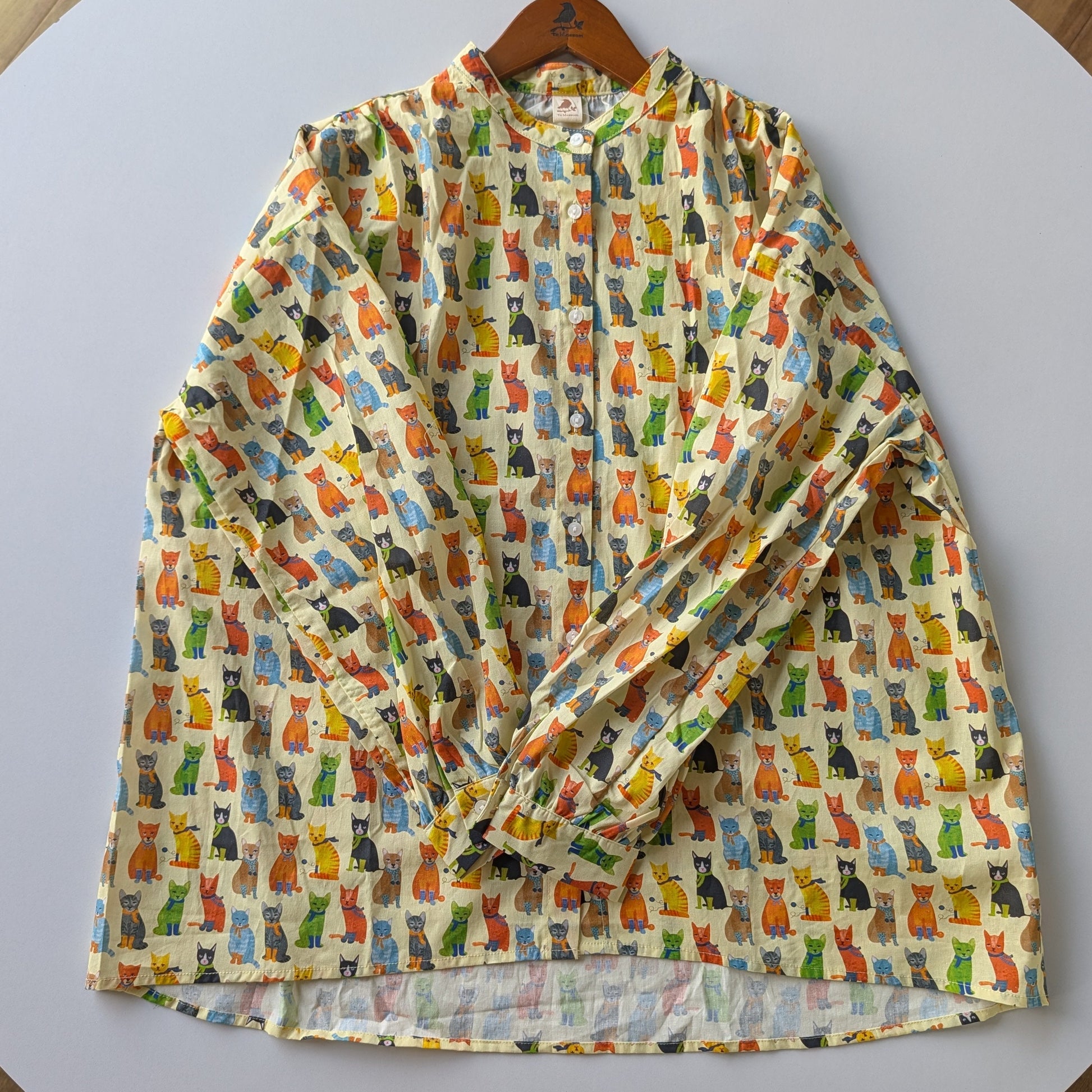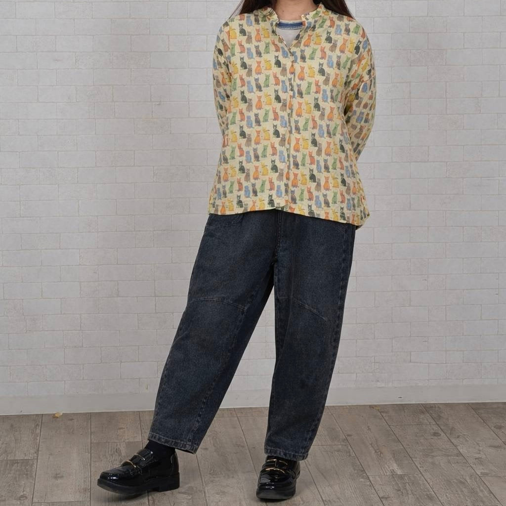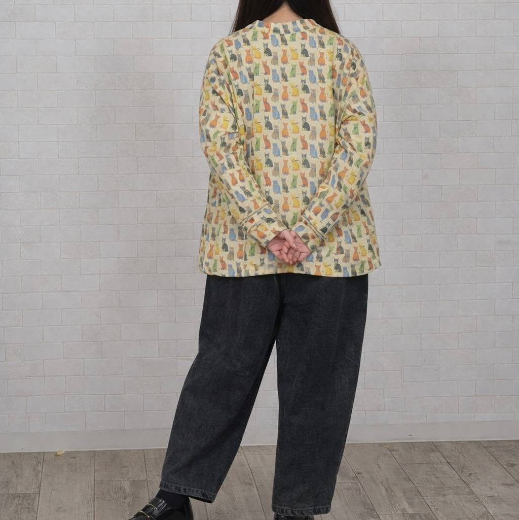 一見すると華やかな総柄、よく見ると愛らしい「顔」や「猫」たちが顔を出す、遊び心満載のブラウスが登場しました。肩に施したギャザーが、女性らしくふんわりとした立体感を演出。顔周りを華やかに見せてくれます。