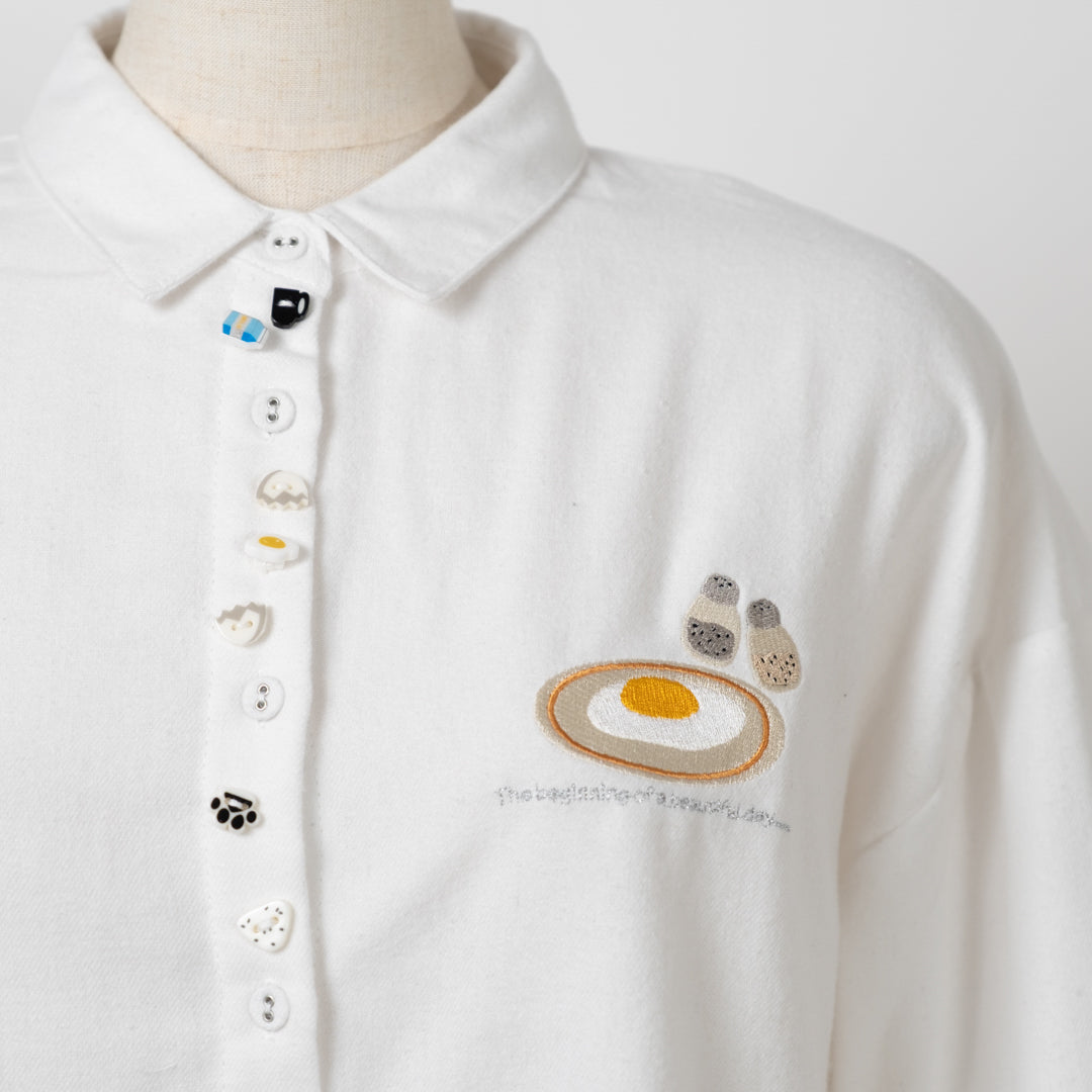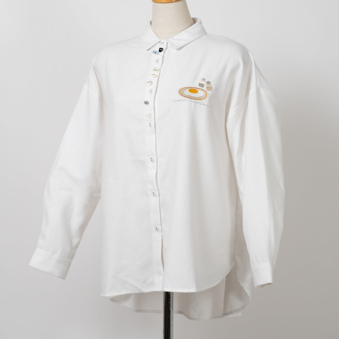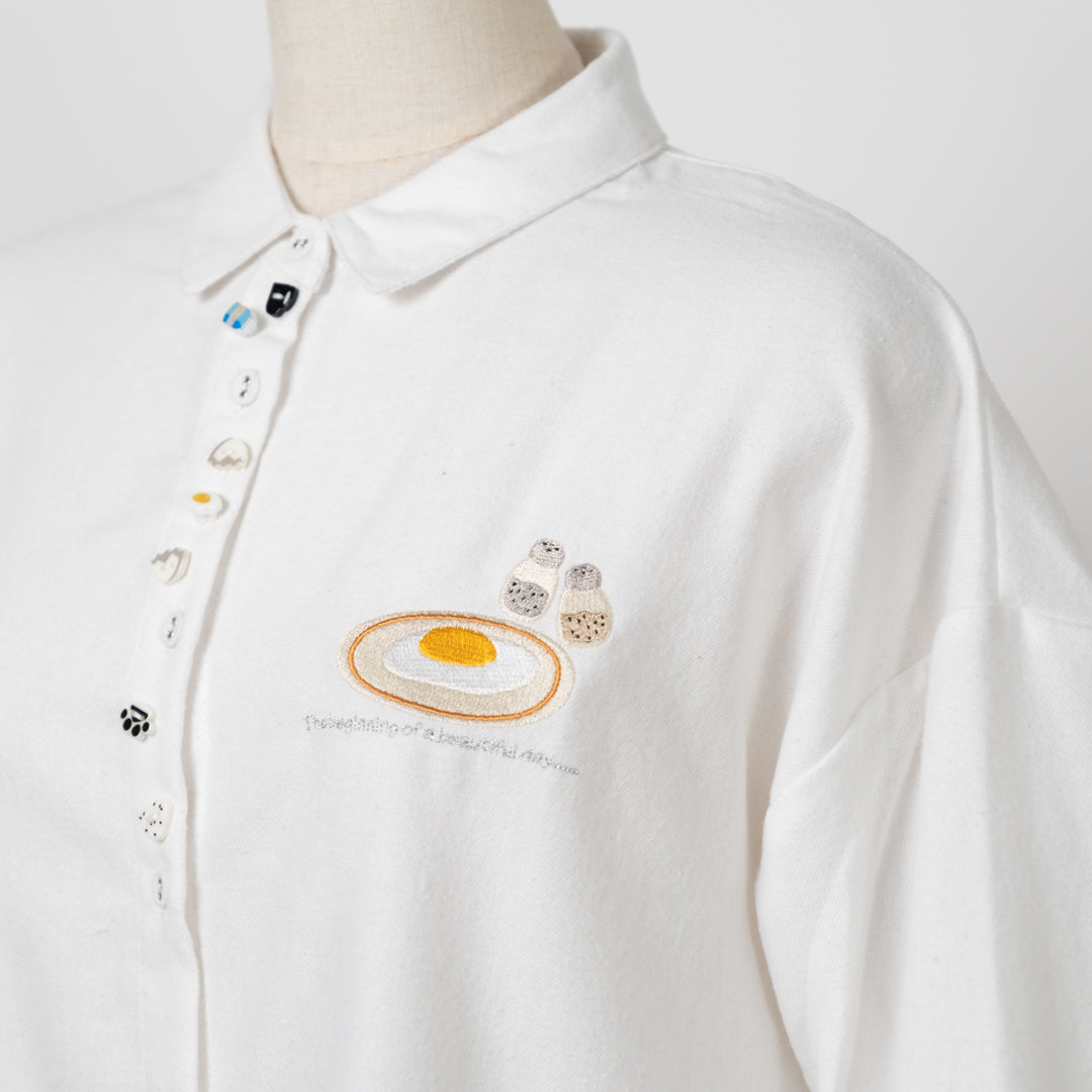 ボタンデザインと、朝食がテーマのユニークな多ボタンが目を引く、デザインシャツで、個性派のための一着です。細部までこだわった仕立てが、着用時に美しいラインを実現。襟元に並ぶ多ボタンが、シンプルながらもさりげないアクセントになります。さらに、胸元には朝食モチーフの刺繍をあしらい、日常のコーディネートにユーモラスな個性と遊び心をプラスします。