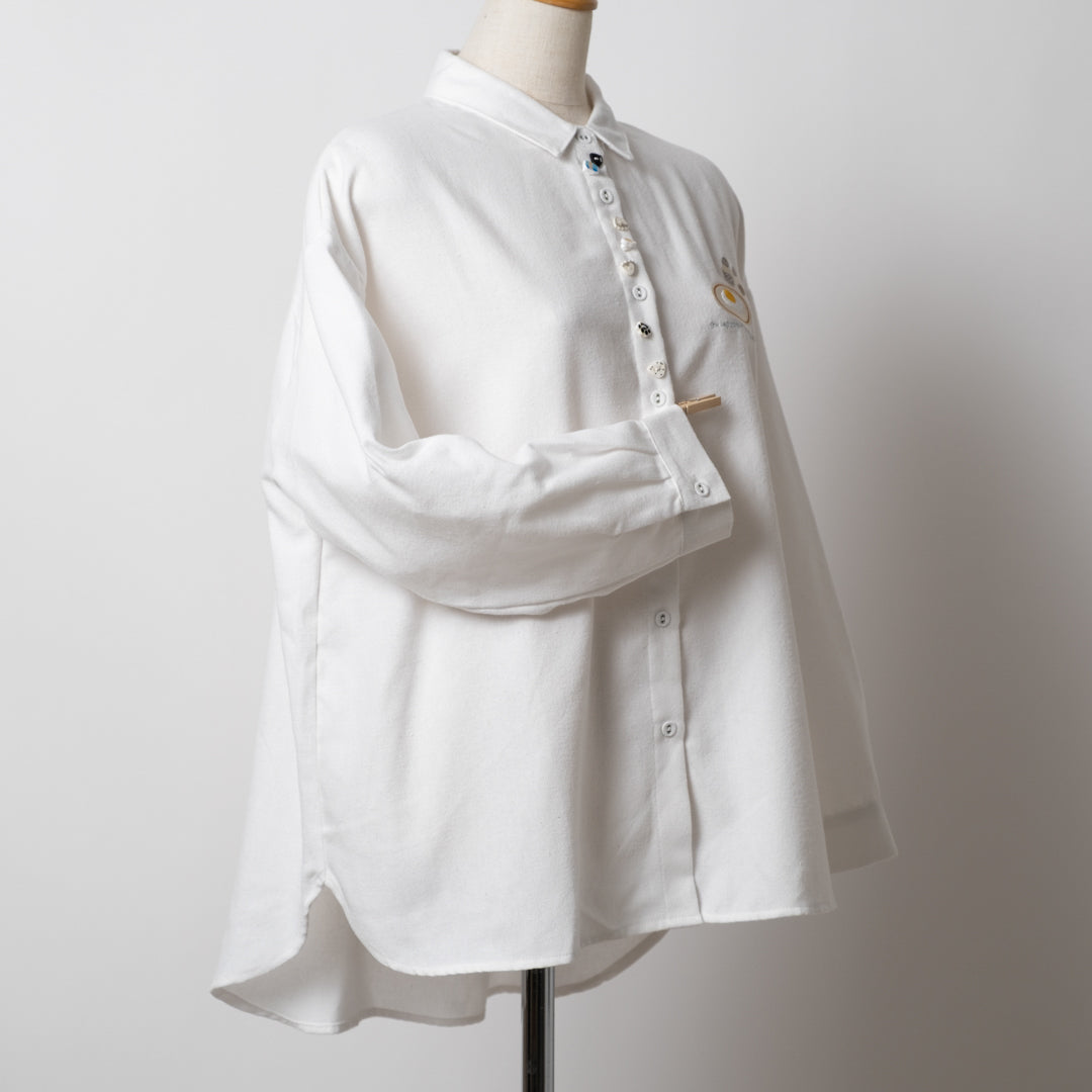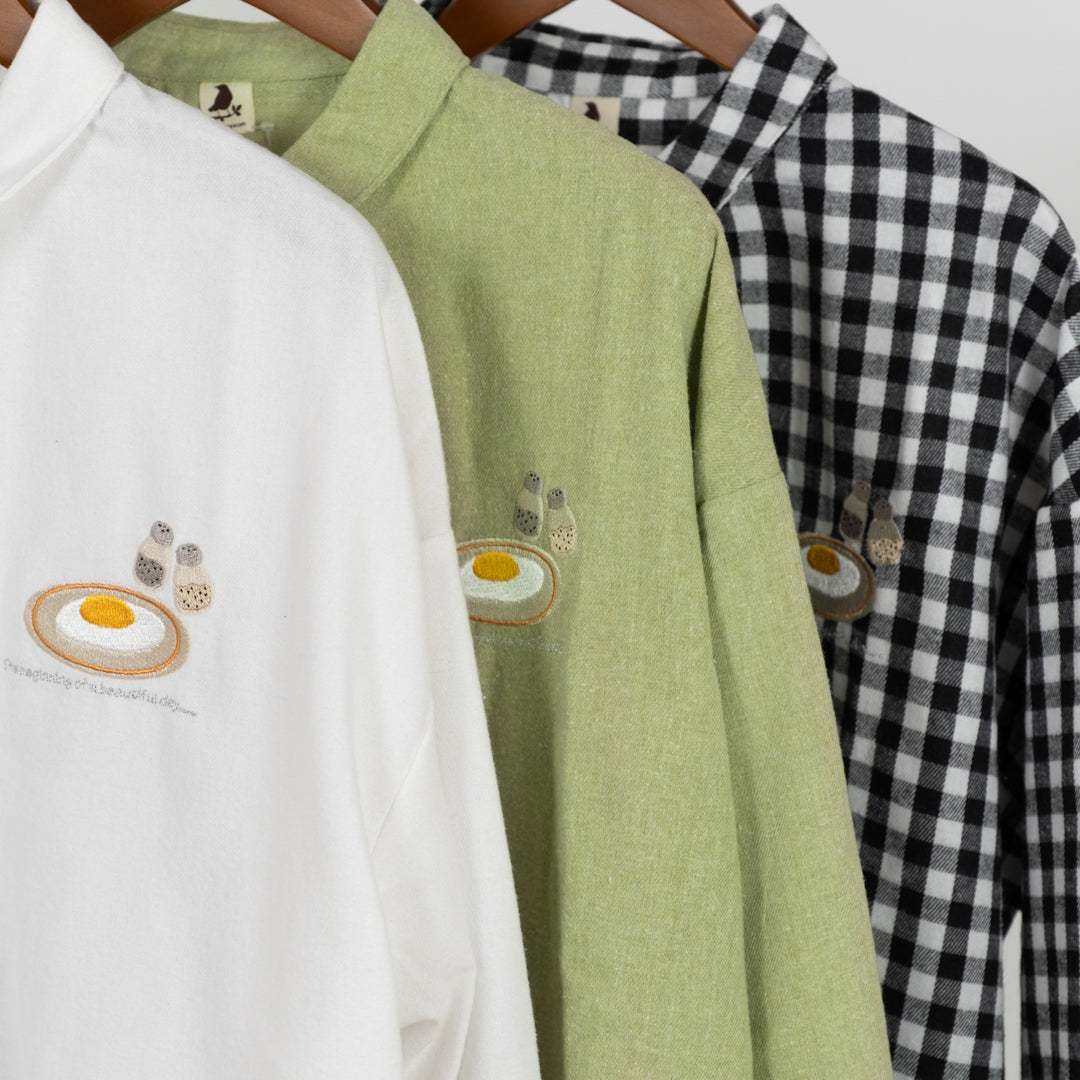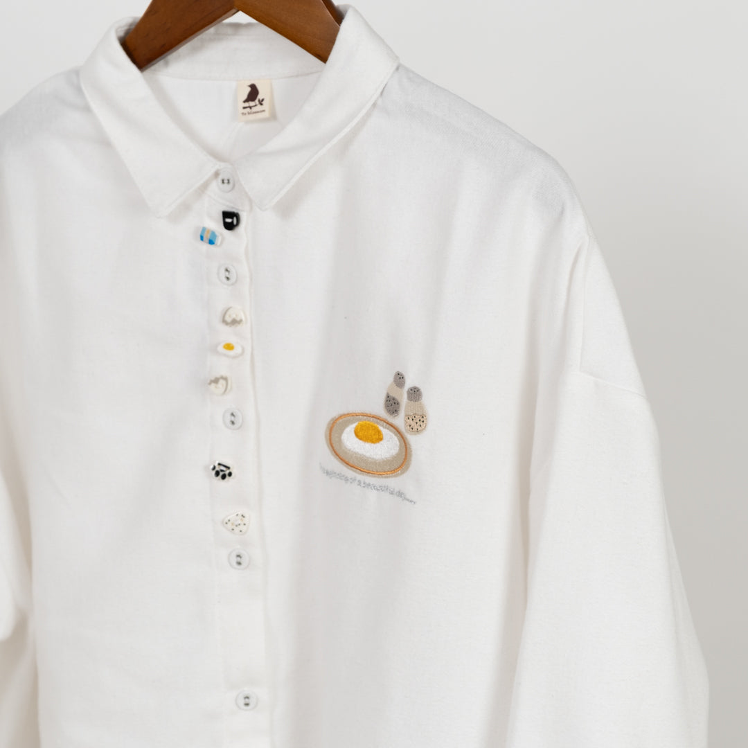 ボタンデザインと、朝食がテーマのユニークな多ボタンが目を引く、デザインシャツで、個性派のための一着です。細部までこだわった仕立てが、着用時に美しいラインを実現。襟元に並ぶ多ボタンが、シンプルながらもさりげないアクセントになります。さらに、胸元には朝食モチーフの刺繍をあしらい、日常のコーディネートにユーモラスな個性と遊び心をプラスします。