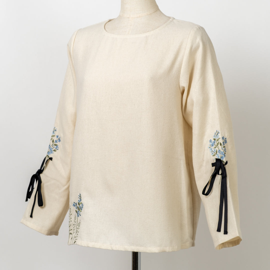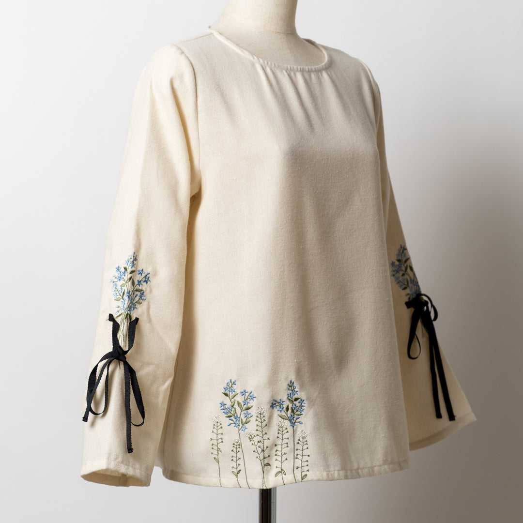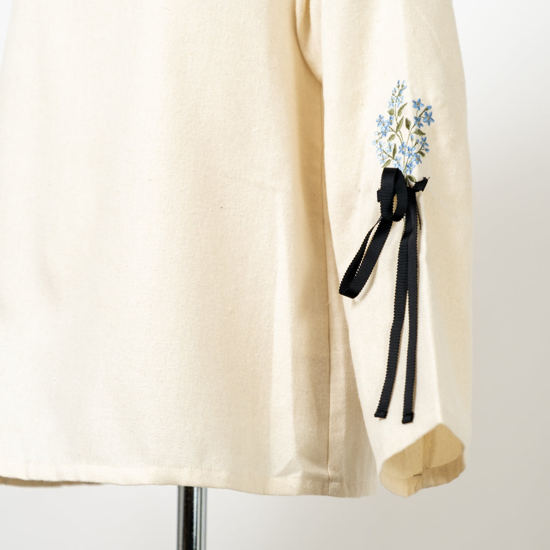 袖に施された繊細なブーケ刺しゅうが、圧倒的な存在感を放つブラウスです。上質な生地を使用し、刺しゅうによって描かれた花々は、まるで本物のブーケのような立体感と華やかさ。着るだけで、女性らしい洗練された印象と、ワンランク上のエレガントな雰囲気を与えます。
