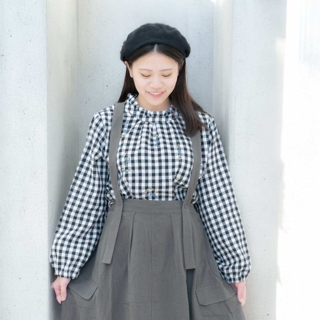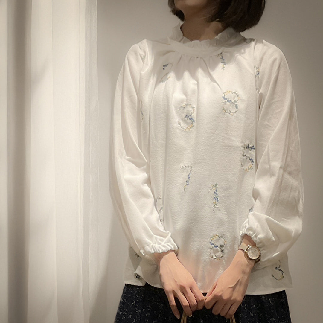 身頃にあしらわれた繊細な数字花の刺繍が、他にはないユニークで上品なアクセントを添えます。さらに、フェミニンなフリルデザインが顔周りを華やかに演出し、洗練された印象を与えます。