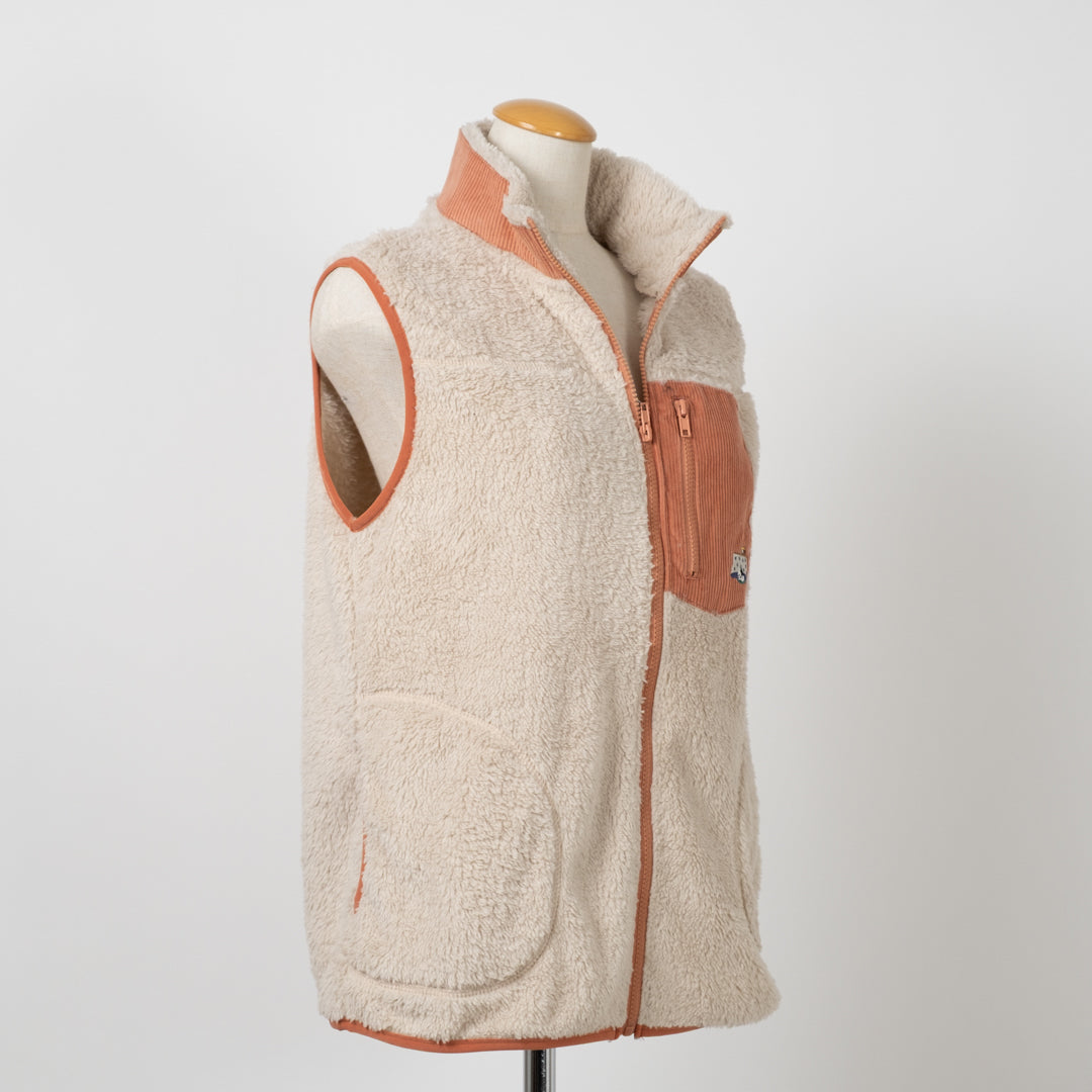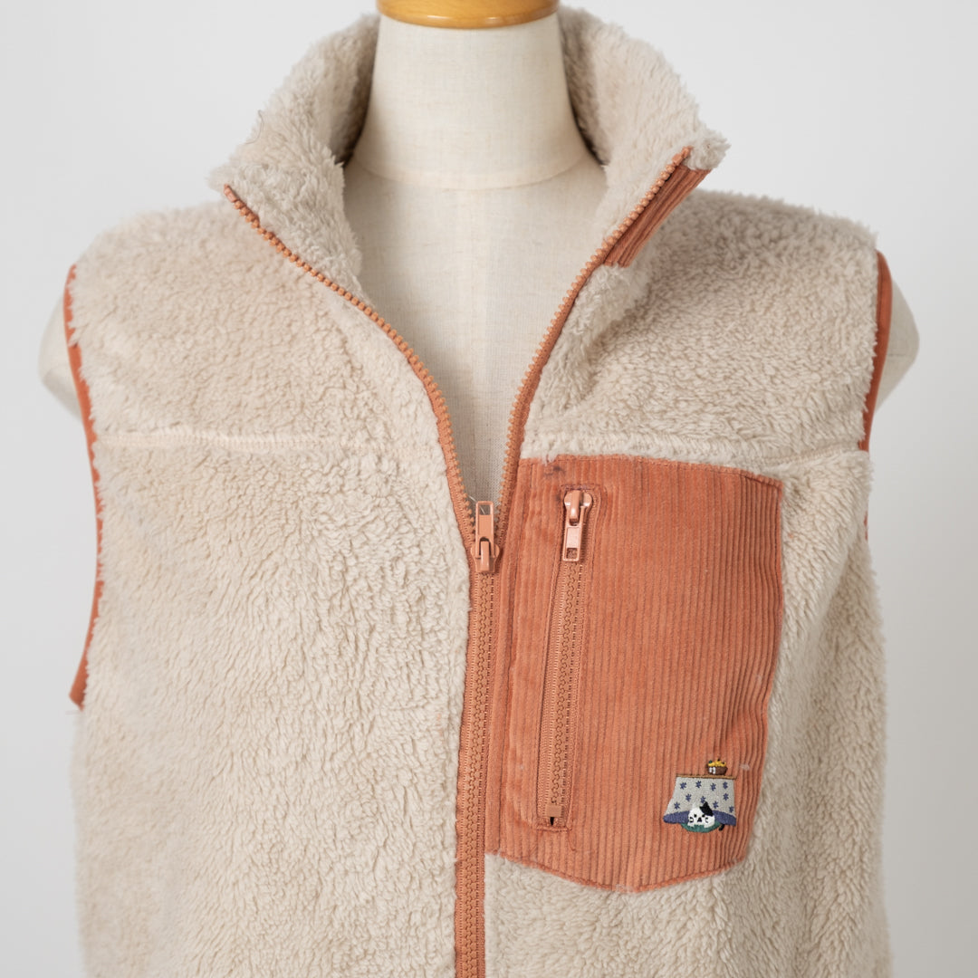 ふんわりボア素材のこたつ猫刺しゅうボアベスト。保温性抜群で暖かい冬のカジュアルコーデにぴったり。可愛いこたつ猫の刺しゅうがおしゃれなポイント!軽量で動きやすいので、室内・屋外問わず快適。重ね着にも最適な冬の人気アイテムです。