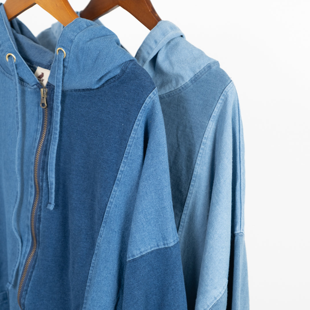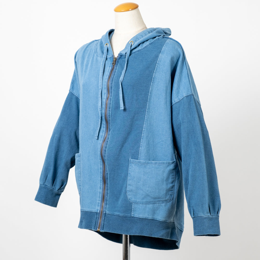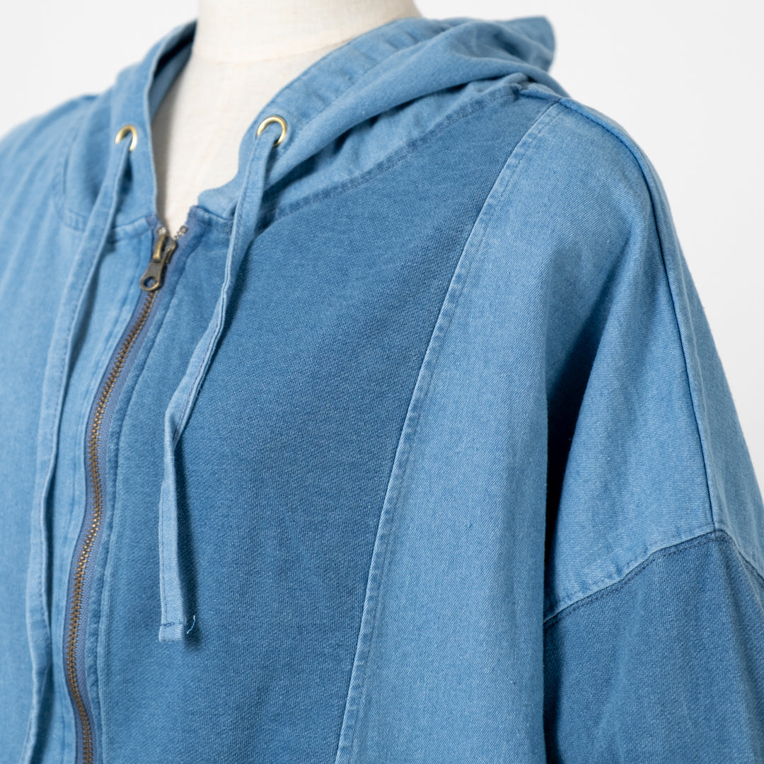 上質なインディゴ裏毛と布帛の切り替えデザインが魅力のZIPパーカー。裏毛が快適な保温性を、ジップアップ仕様が楽な着脱を実現。インディゴ染めの風合いが大人カジュアルを格上げし、きれいめにも対応します。軽やかで季節の変わり目に最適な着回し力抜群のフーディーです。