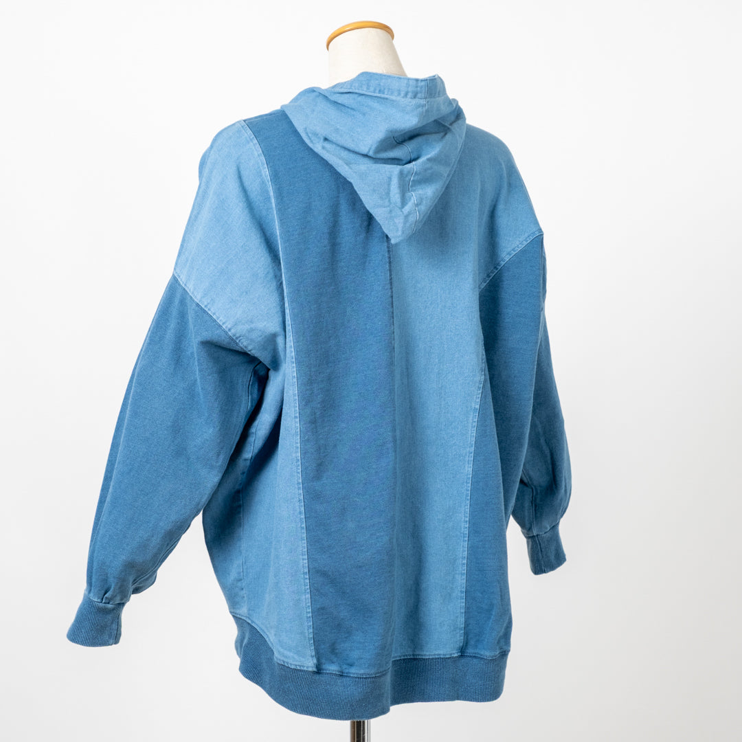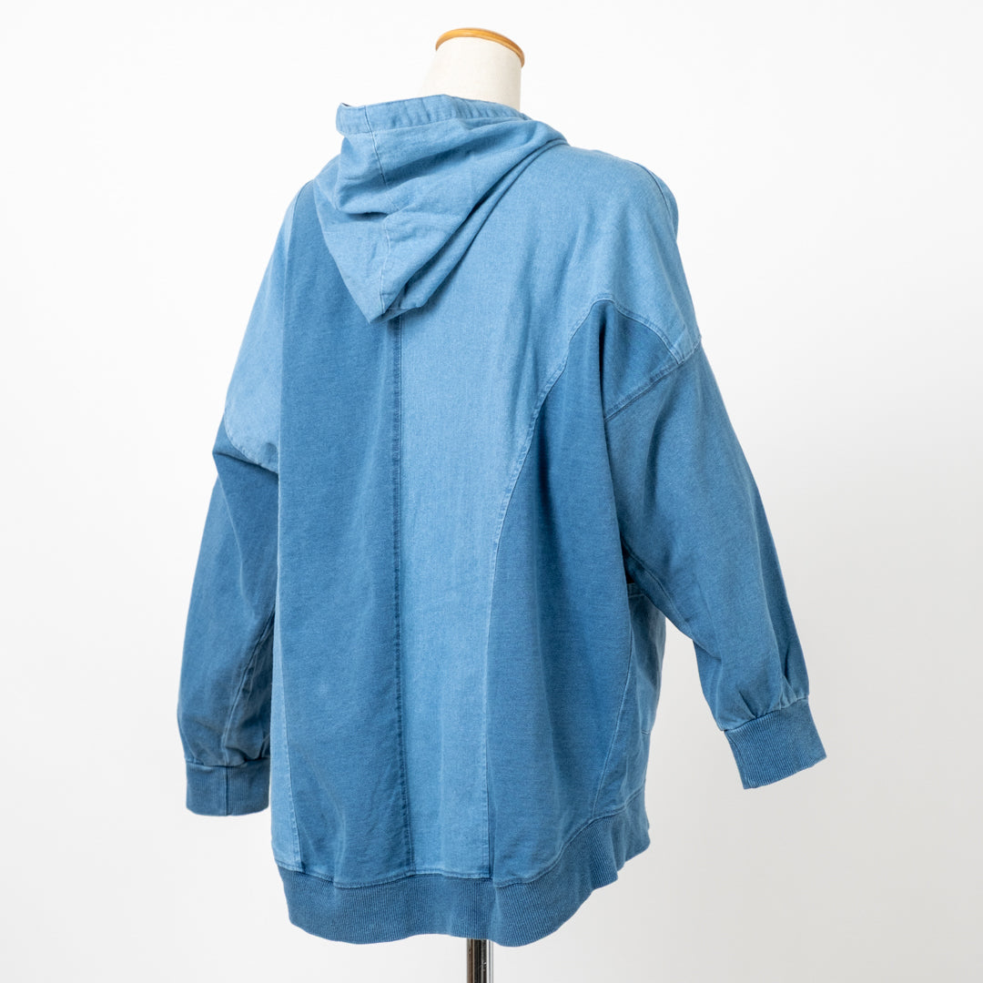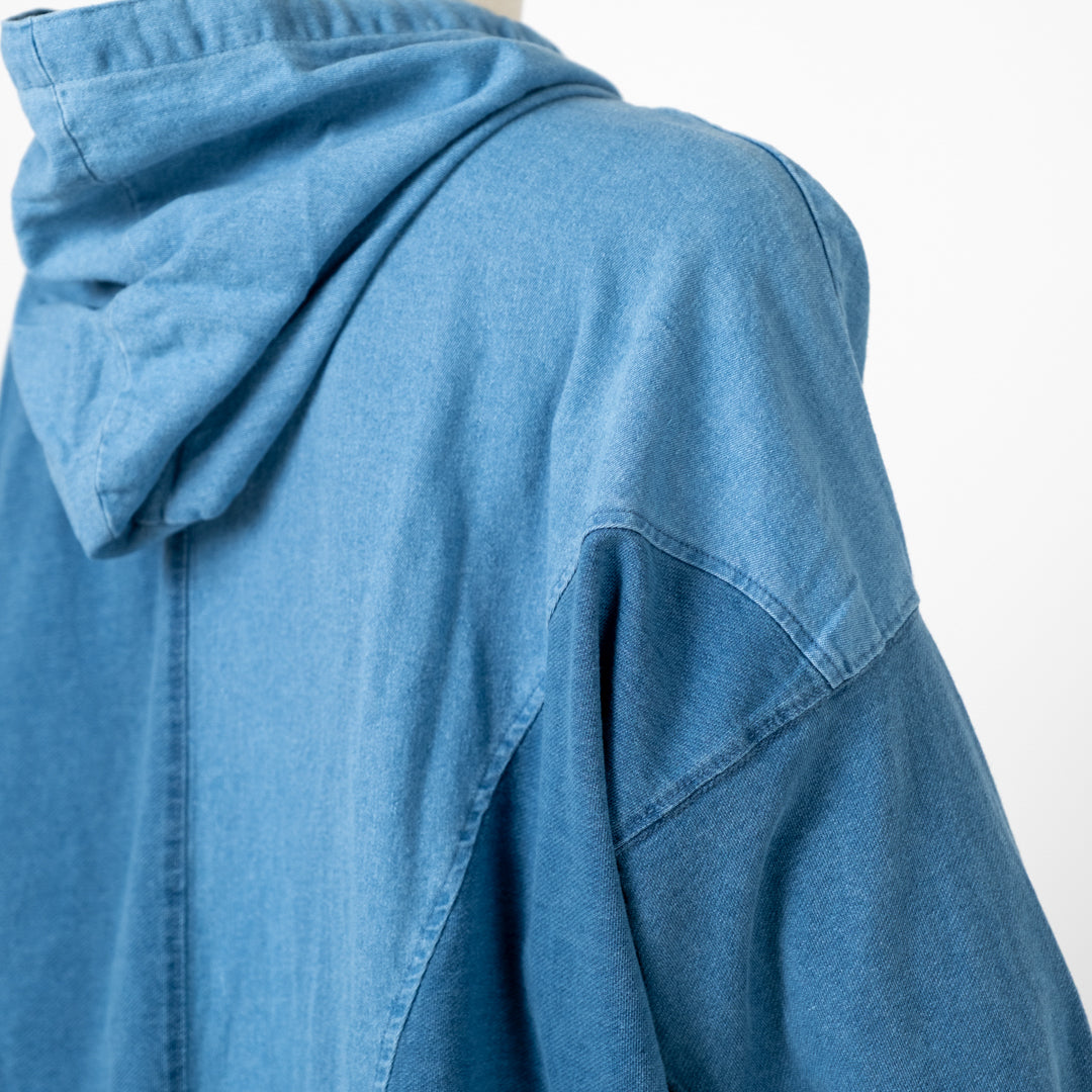 上質なインディゴ裏毛と布帛の切り替えデザインが魅力のZIPパーカー。裏毛が快適な保温性を、ジップアップ仕様が楽な着脱を実現。インディゴ染めの風合いが大人カジュアルを格上げし、きれいめにも対応します。軽やかで季節の変わり目に最適な着回し力抜群のフーディーです。