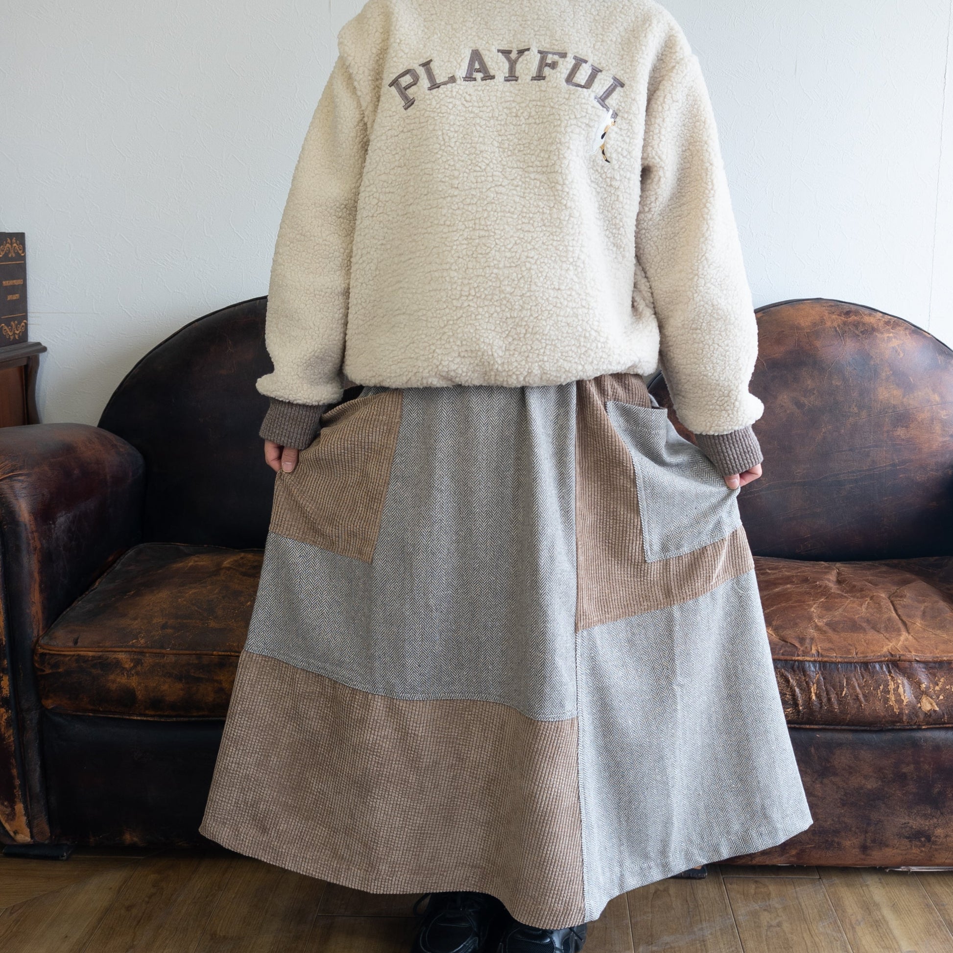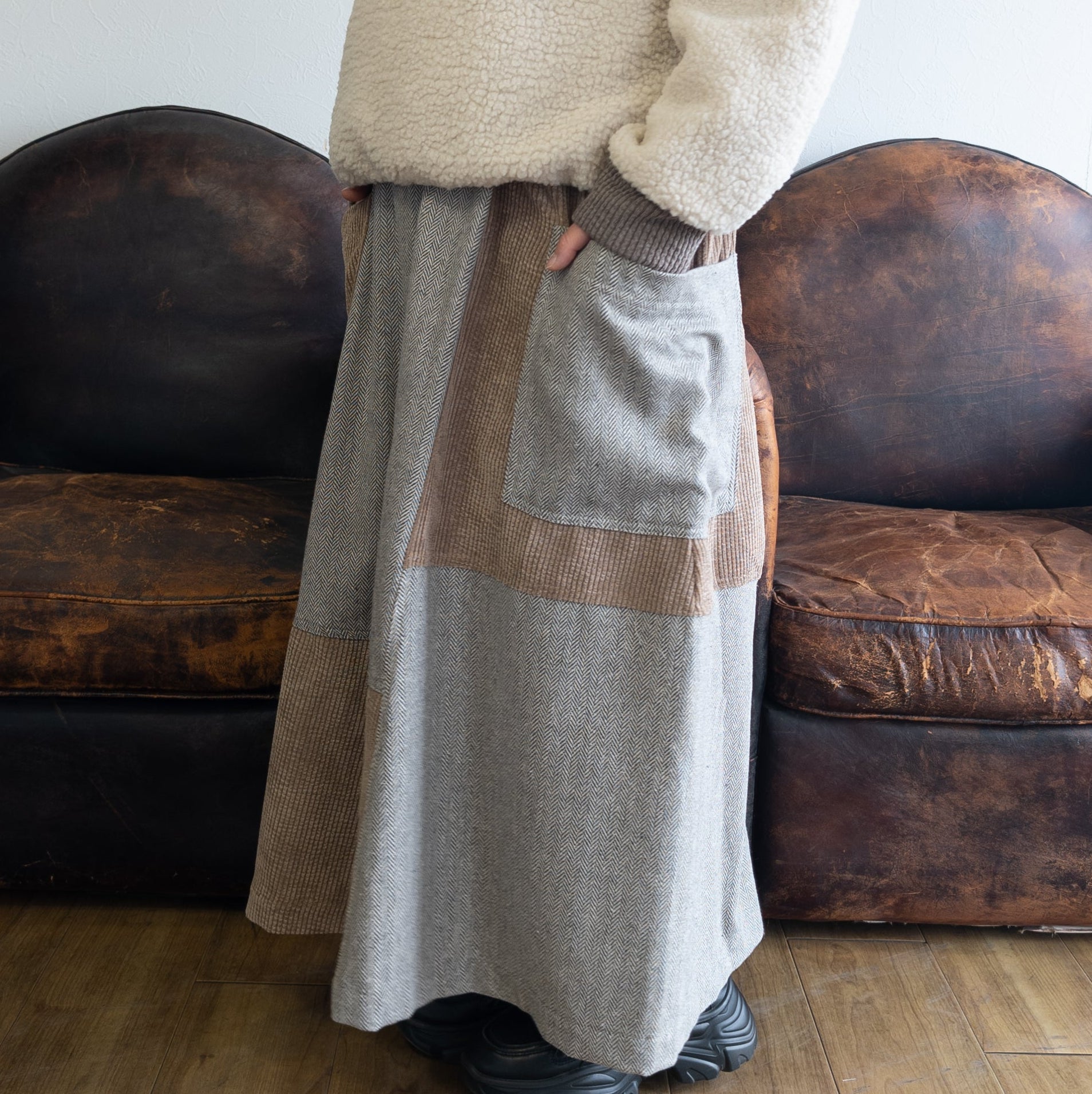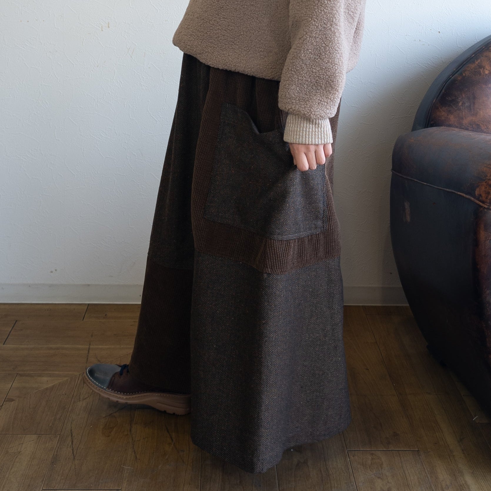 ヘリンボーンパターンの生地にコール生地をパッチワーク状に継ぎはぎした、遊び心あふれるフレアスカート。幾何学模様が織りなす立体感と、ボリュームのあるシルエットが、一枚で視線を集める主役級の一枚。レトロモダンな雰囲気を纏いながら、どんなトップスとも相性よく合わせられる懐の深さが魅力。素材の質感とパッチワークの配置が生み出す、ほどよい遊び心で、いつものコーディネートに新しい表情をプラスします。