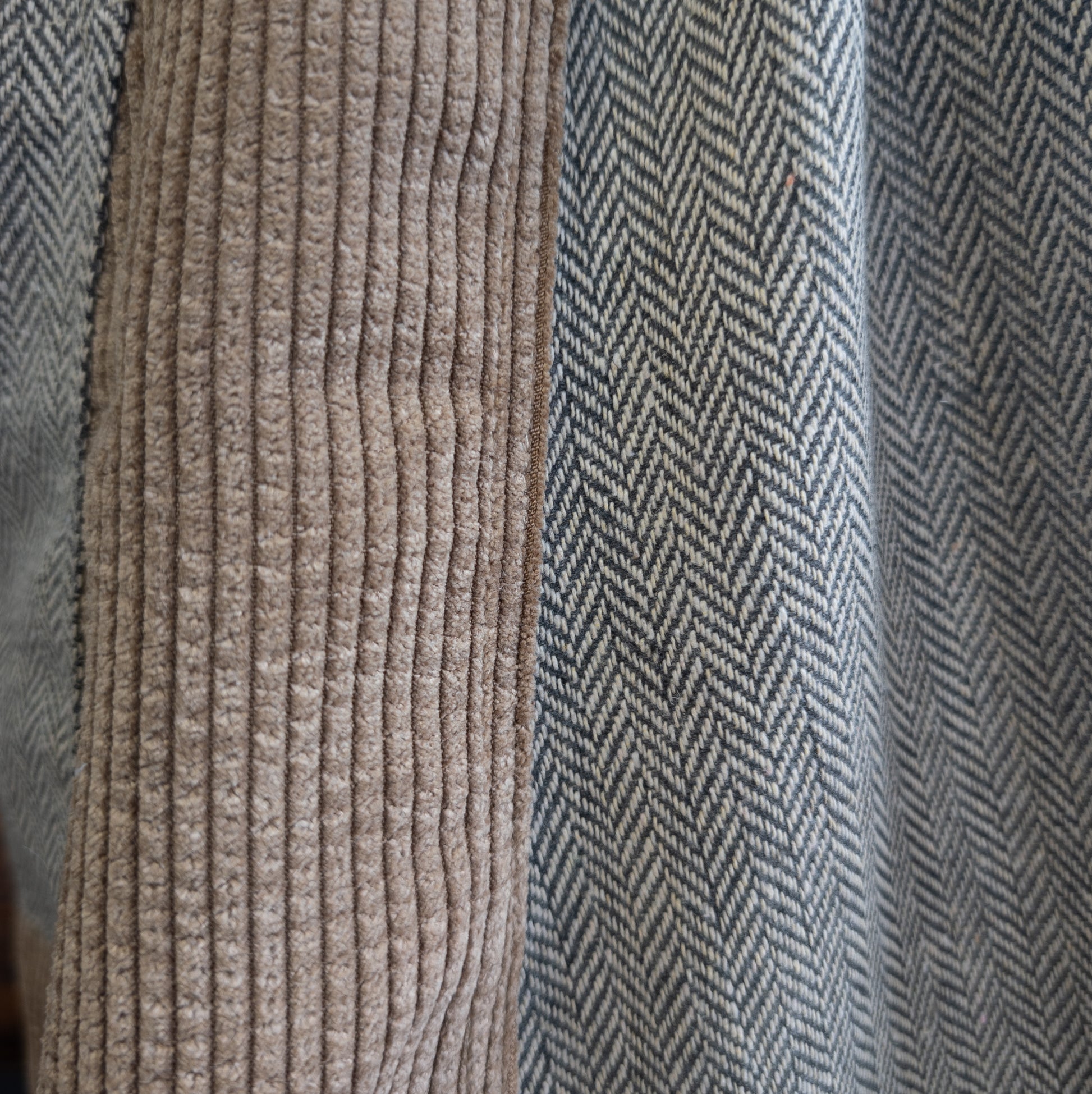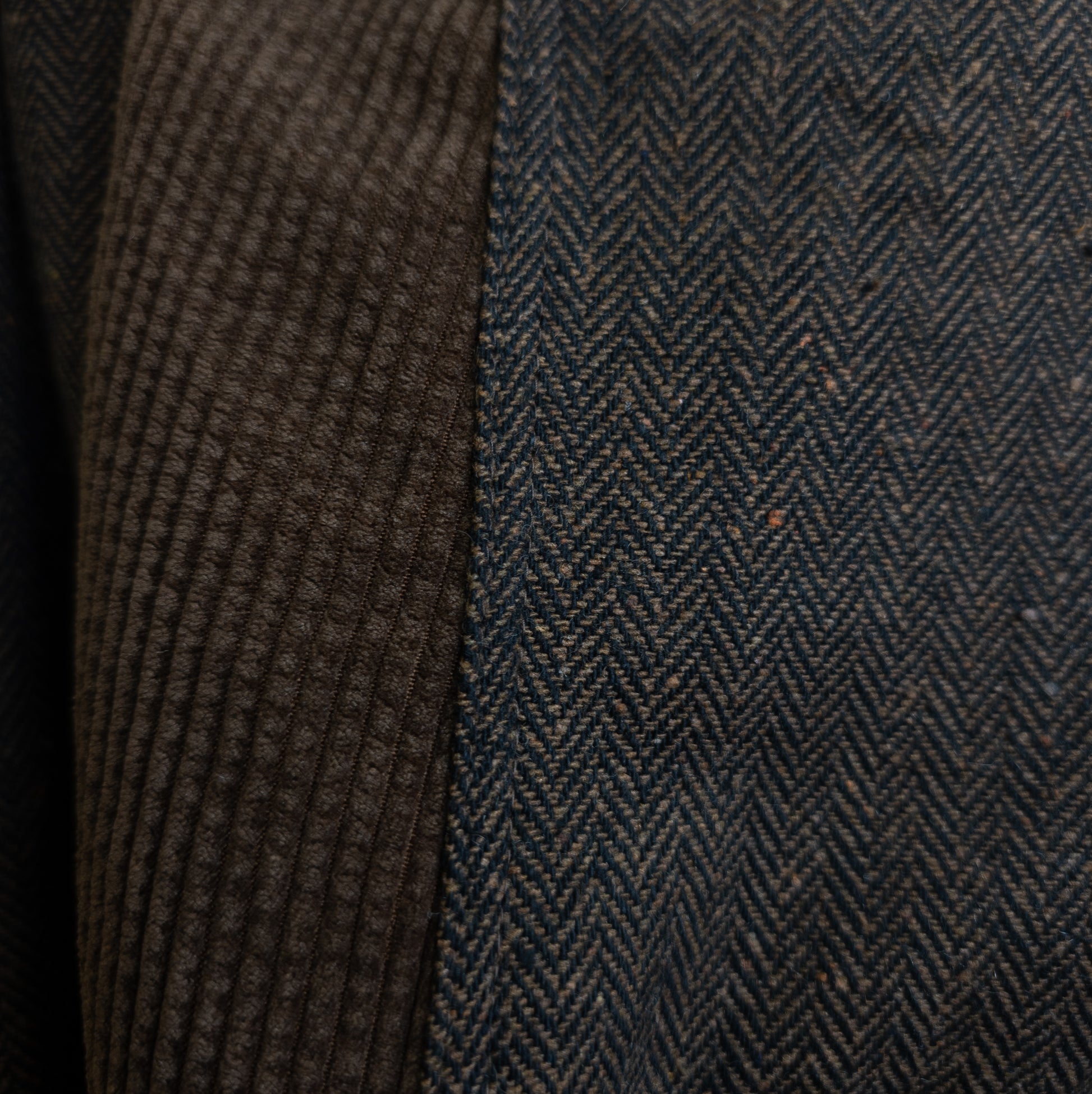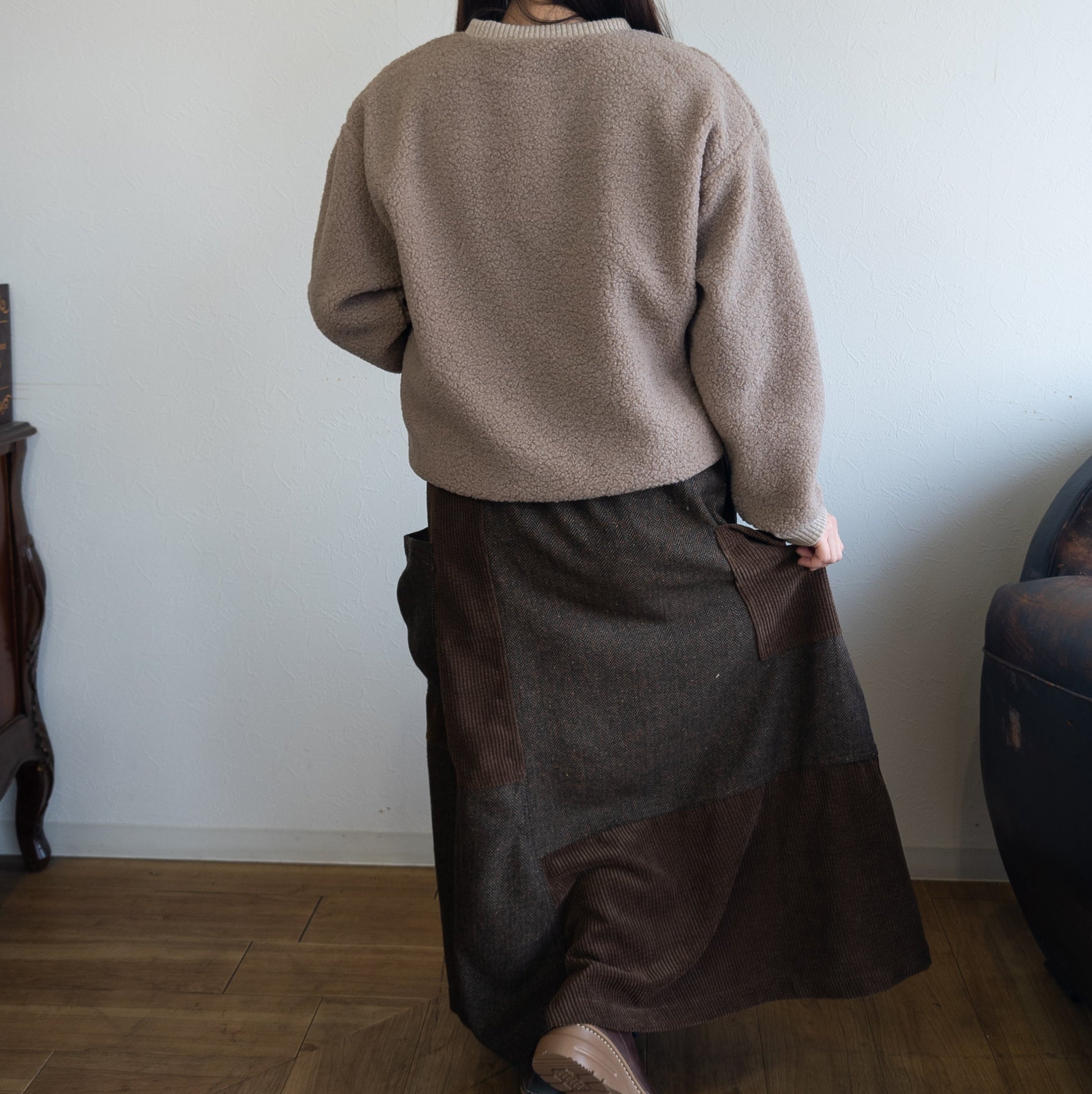 ヘリンボーンパターンの生地にコール生地をパッチワーク状に継ぎはぎした、遊び心あふれるフレアスカート。幾何学模様が織りなす立体感と、ボリュームのあるシルエットが、一枚で視線を集める主役級の一枚。レトロモダンな雰囲気を纏いながら、どんなトップスとも相性よく合わせられる懐の深さが魅力。素材の質感とパッチワークの配置が生み出す、ほどよい遊び心で、いつものコーディネートに新しい表情をプラスします。