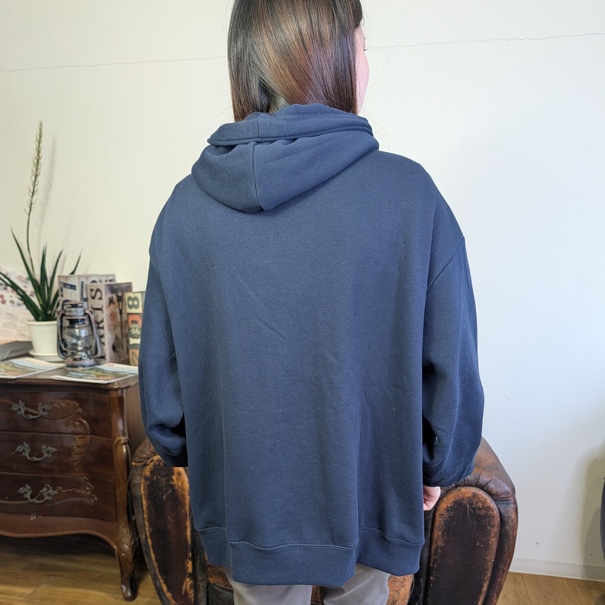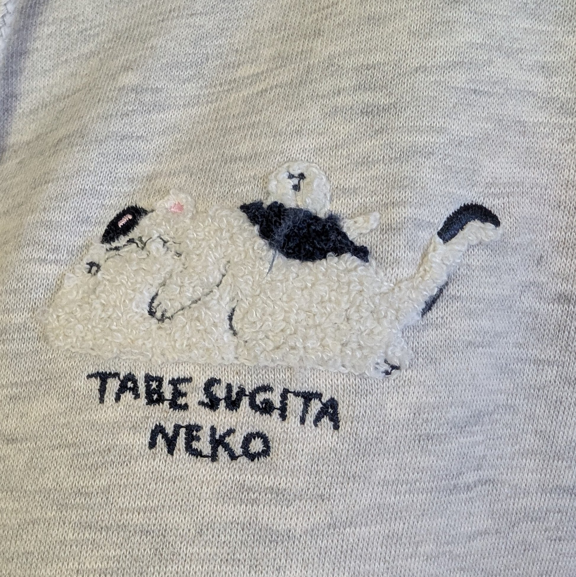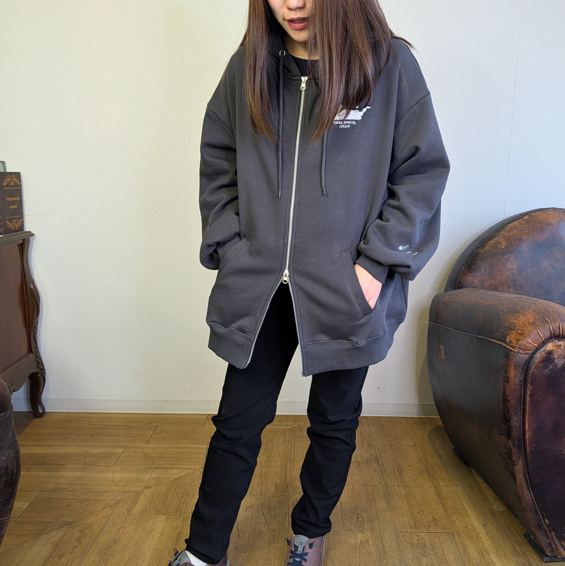 猫の刺繡がアクセントになった裏起毛パーカー。食べ過ぎてしまった猫表情が可愛さしく立体的な刺繡で生き生きと表現されています。肌触りの良い裏起毛素材で、冬の日常をあたたかく包み込みます。ゆったりとしたシルエットは、重ね着もしやすく、季節を通じて活躍。
