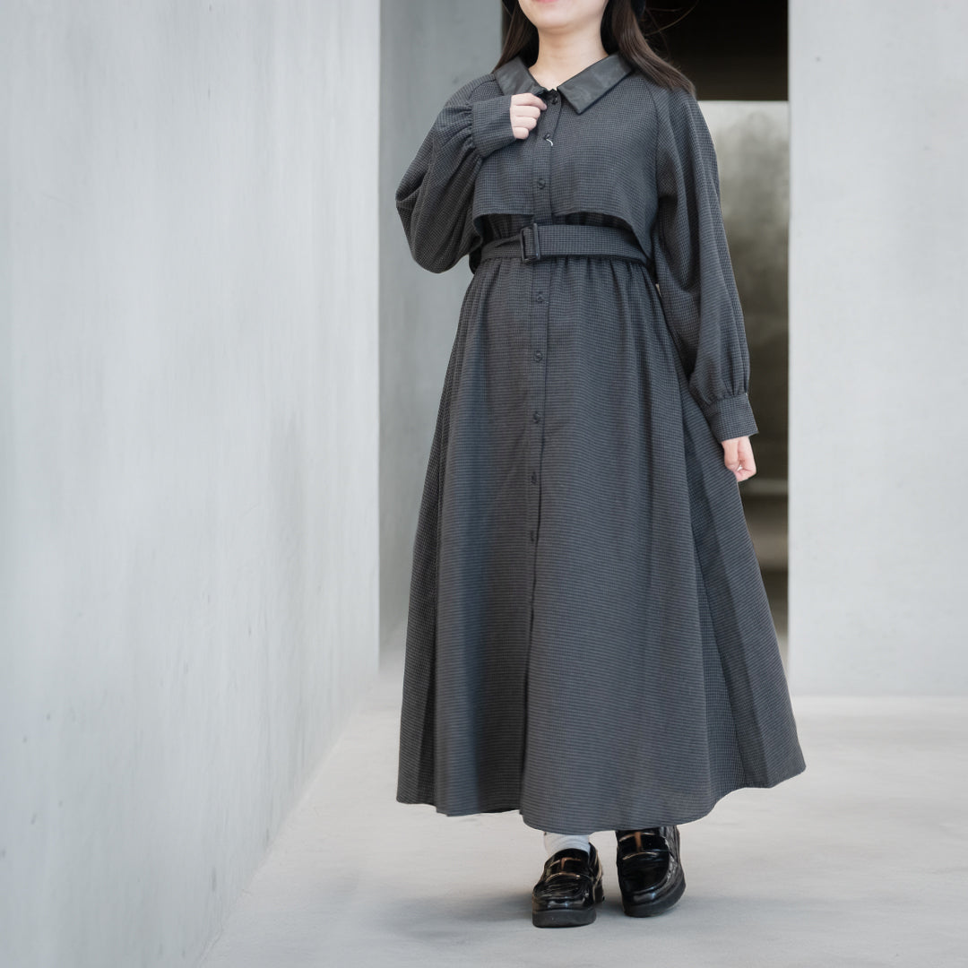 合皮素材の襟をあしらったトレンチデザインのワンピースは、上品な光沢としなやかな質感が魅力のきれいめアイテムです。クラシックなトレンチワンピースをモダンにアップデートし、動くたびに揺れる軽やかな素材で、ストレスフリーな着心地を実現しました。