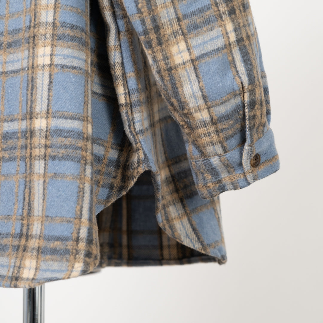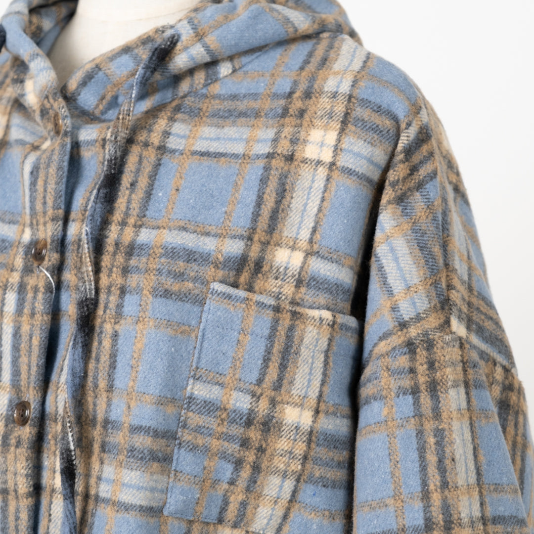 ボリュームのあるシャギー素材とクラシックなチェック柄が魅力のフーディシャツ。オーバーサイズでレイヤリングしやすく、柔らかく温かい生地感が秋冬カジュアルを格上げ。フードが顔周りを優しく演出し、デイリーウェアからリラックススタイルまで幅広く活躍します。寒い季節のおしゃれと暖かさを両立する一枚です!