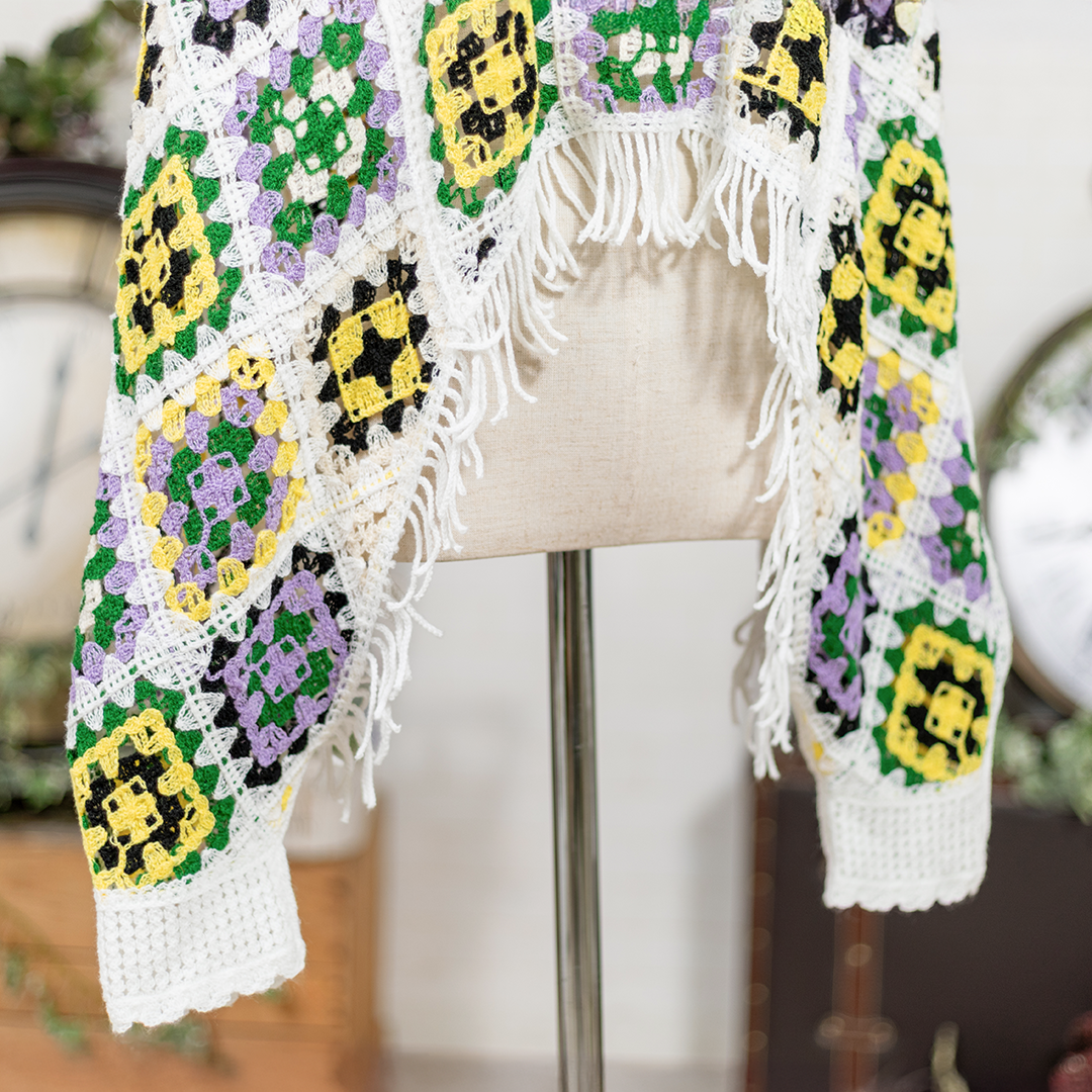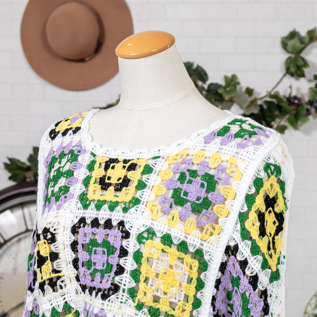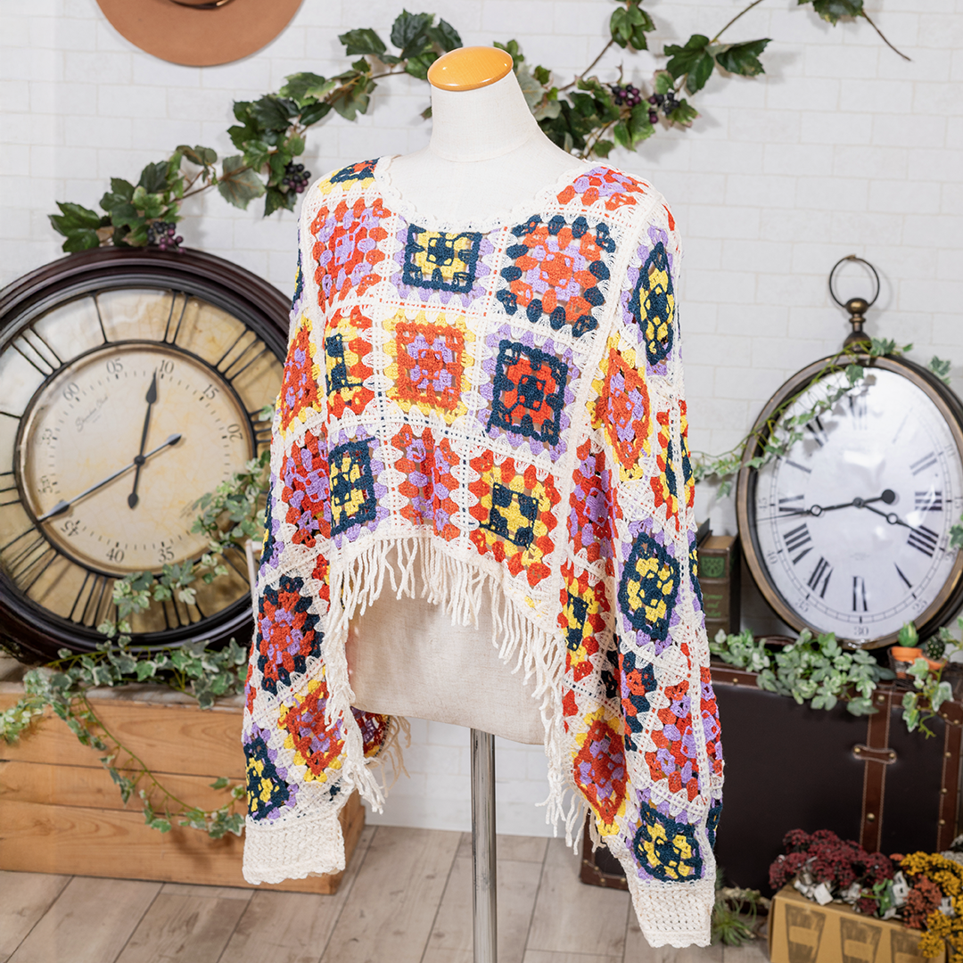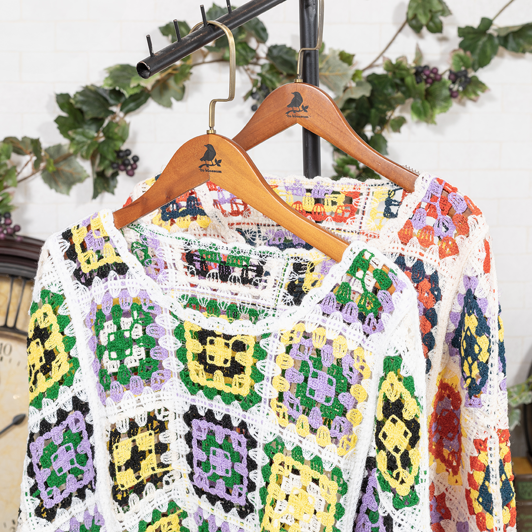 クロシェ編みのパネルを組み合わせた、パッチワーク風のポンチョ。幾何学模様が織りなす華やかな表情が、どんなスタイルにも存在感をプラスします。軽やかな着心地で、春から秋まで活躍する一枚。to blossomを代表する人気デザインです。