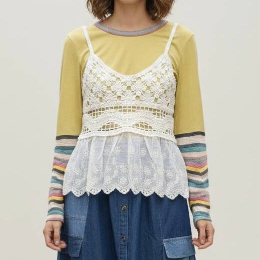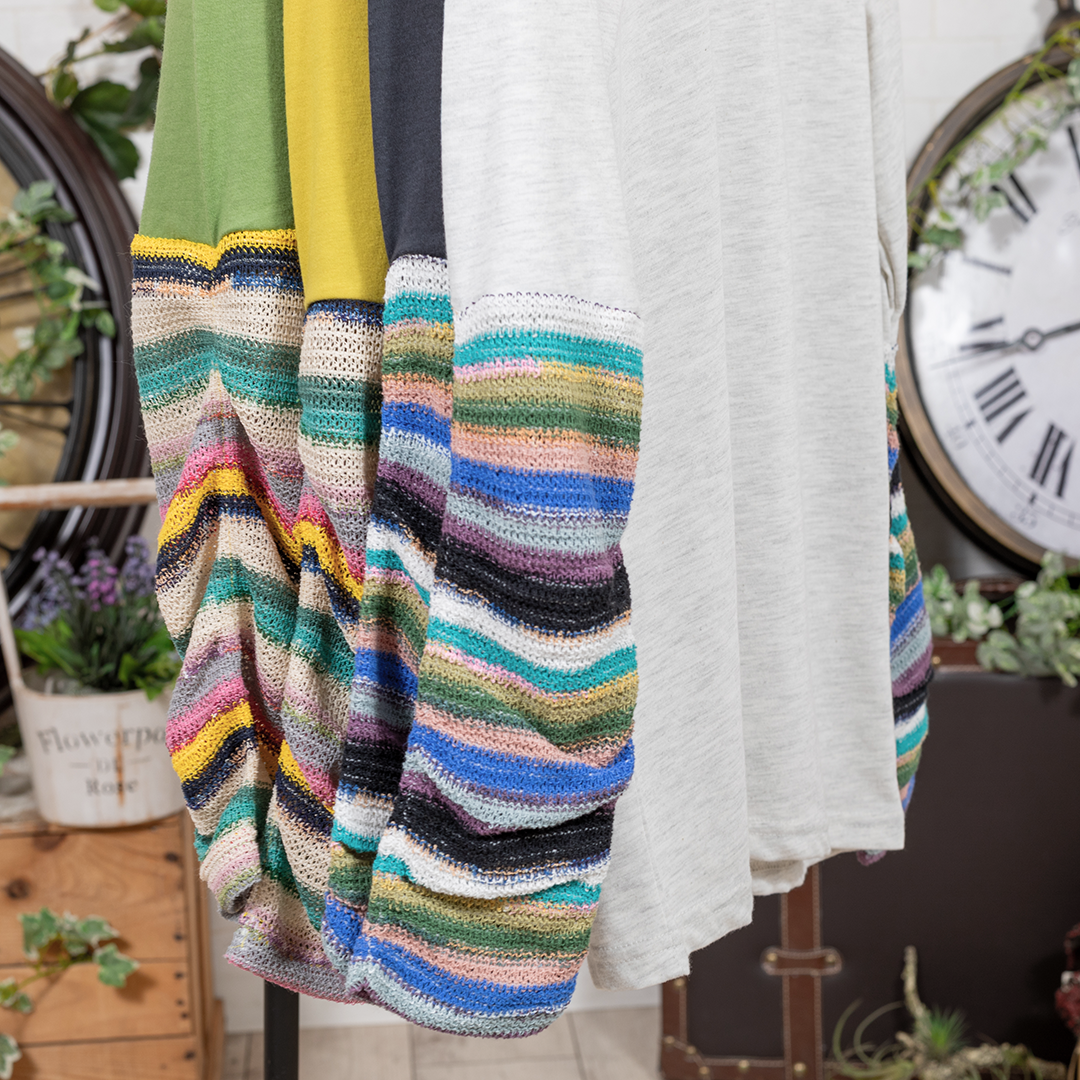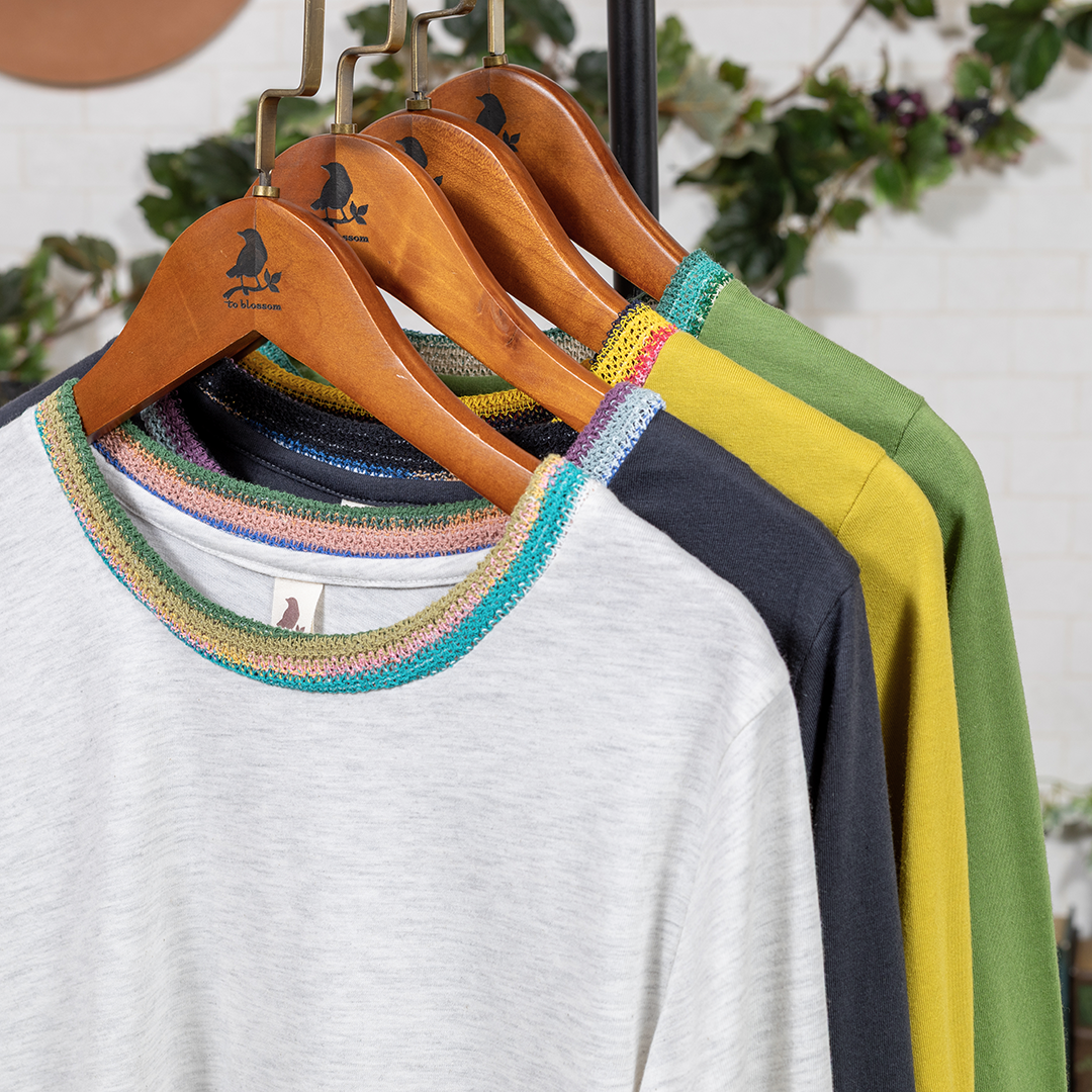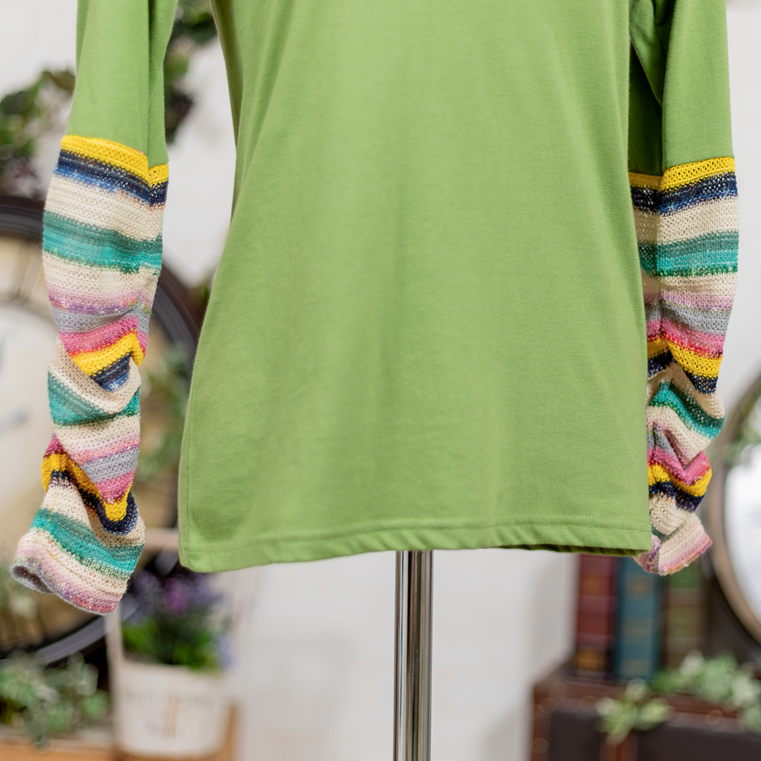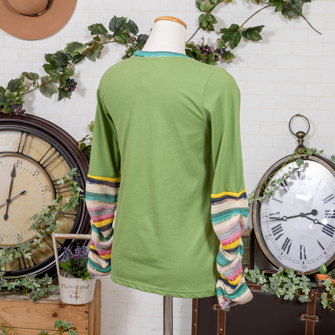袖と首周りに華やかな生地をドッキングした、遊び心あふれるカットソー。シンプルなボディに異素材の切り替えが映え、重ね着やチラ見せで個性的なスタイルを演出できます。日常のコーディネートに、さりげない洒落感をプラス。