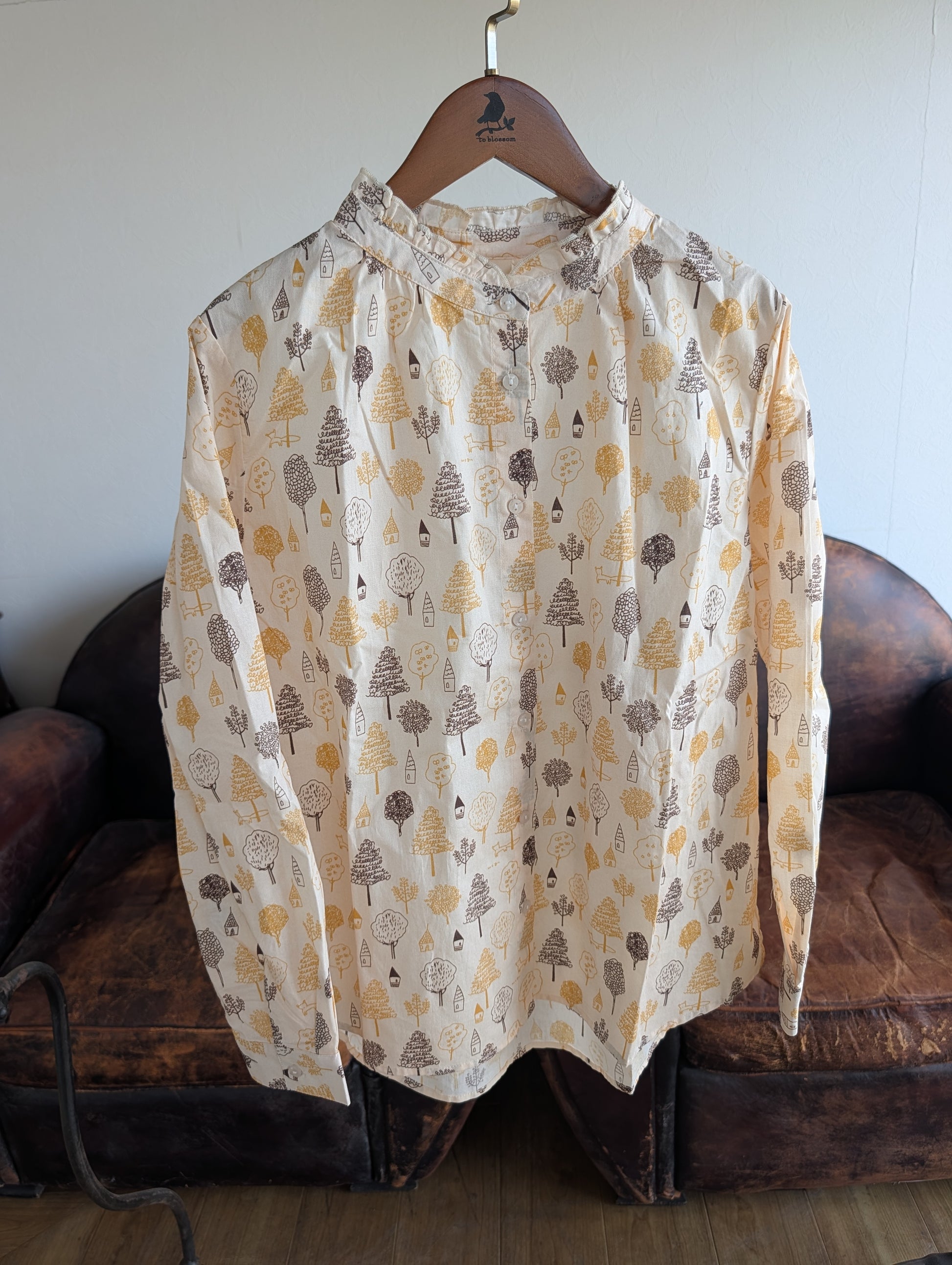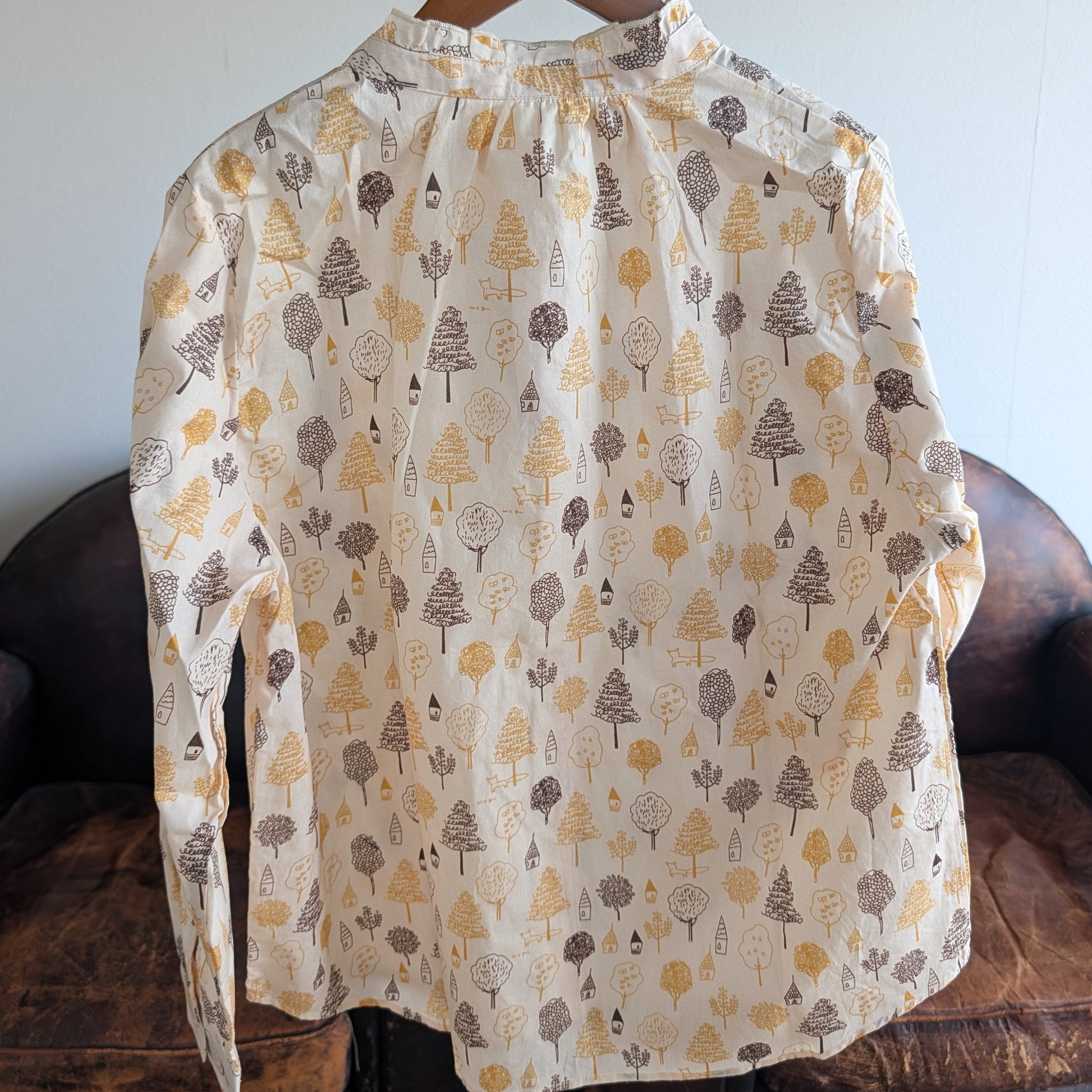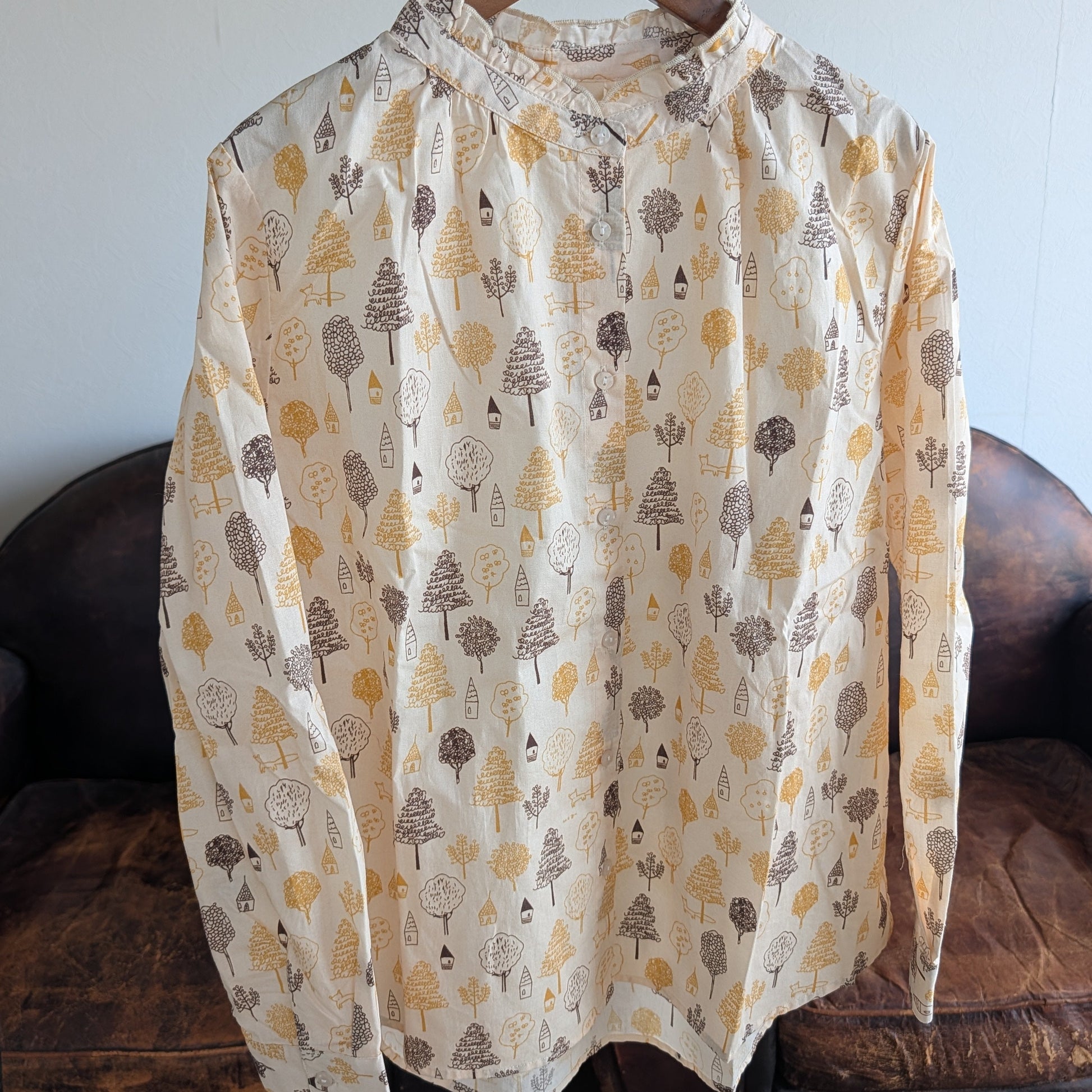 綿100%で肌心地よく、程よい厚みが季節を選ばない万能ブラウス。スタンドカラーのネック部分に遊び心満載のフリルをあしらい、おうちや木のプリントが日常に優しい表情をもたらします。春夏は単独で、秋冬はレイヤリングで活躍。毎日のコーディネートに、ほんのり楽しさを忍ばせた一枚です。