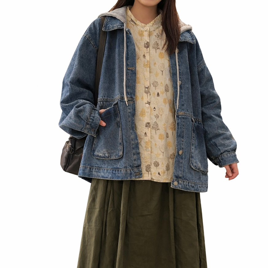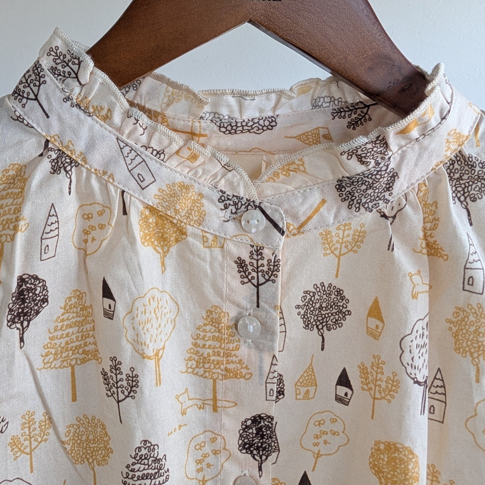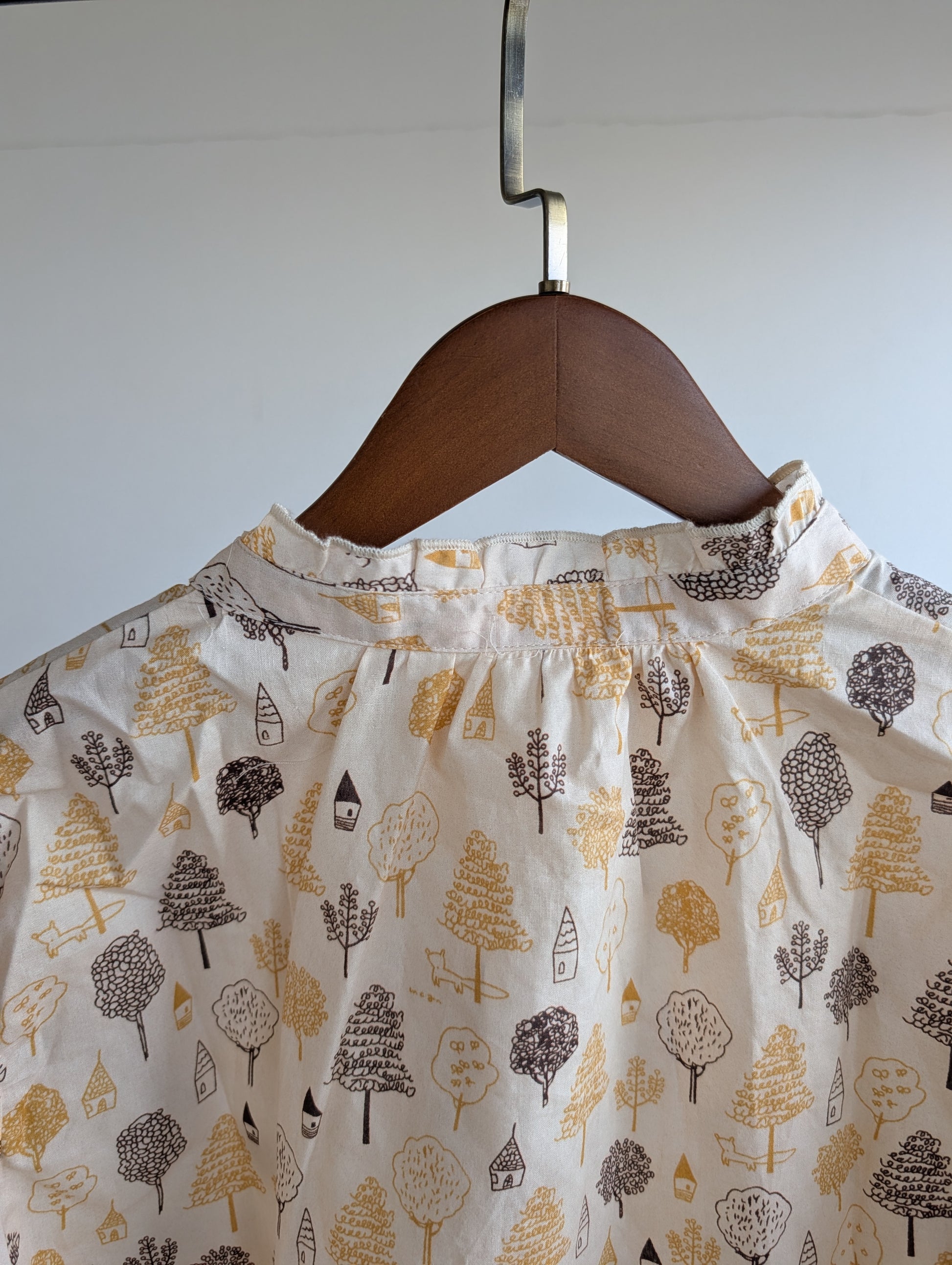 綿100%で肌心地よく、程よい厚みが季節を選ばない万能ブラウス。スタンドカラーのネック部分に遊び心満載のフリルをあしらい、おうちや木のプリントが日常に優しい表情をもたらします。春夏は単独で、秋冬はレイヤリングで活躍。毎日のコーディネートに、ほんのり楽しさを忍ばせた一枚です。