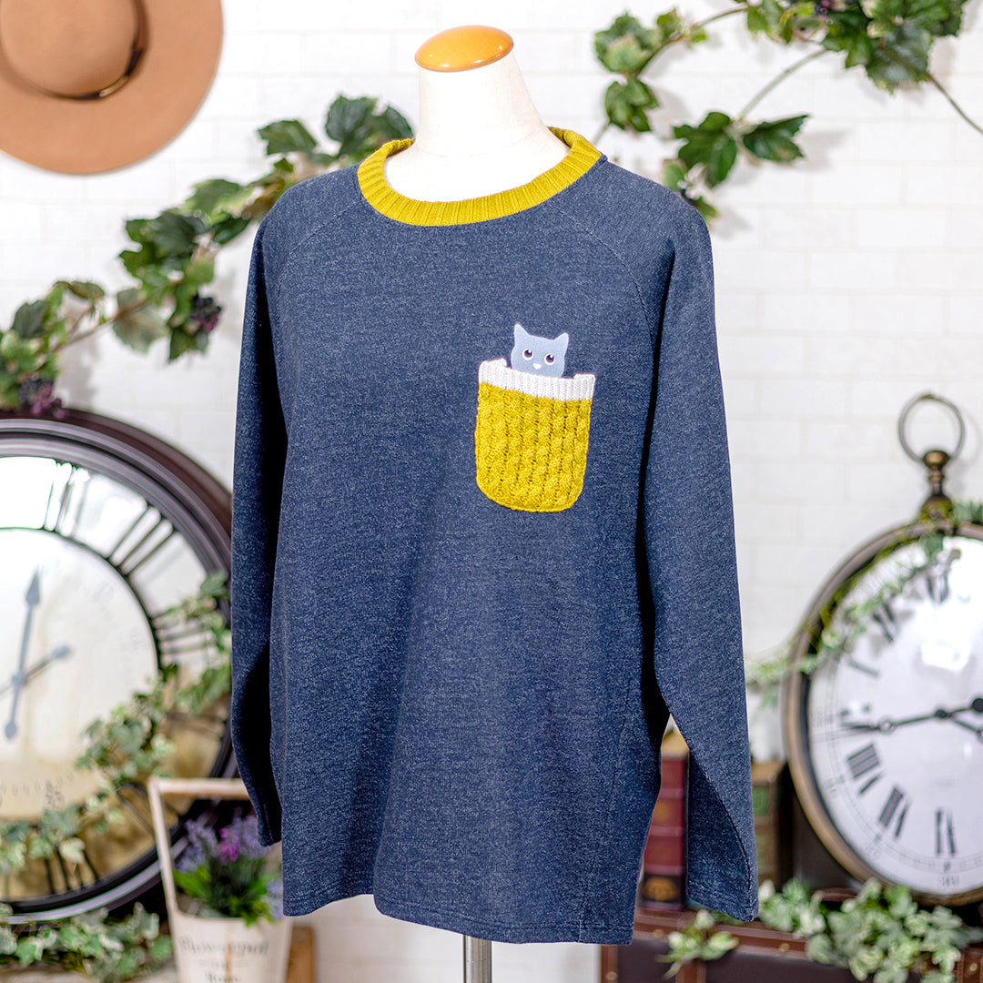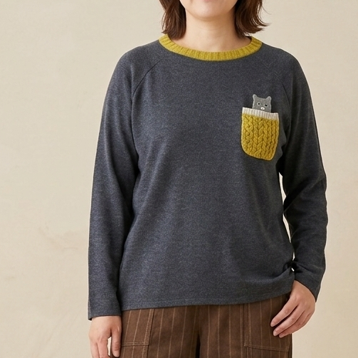 パッと目を引くのは、胸元の小さなニットポケット。そこからひょっこりと顔を出す猫ちゃんに、思わず笑みがこぼれる遊び心満載の一着です。