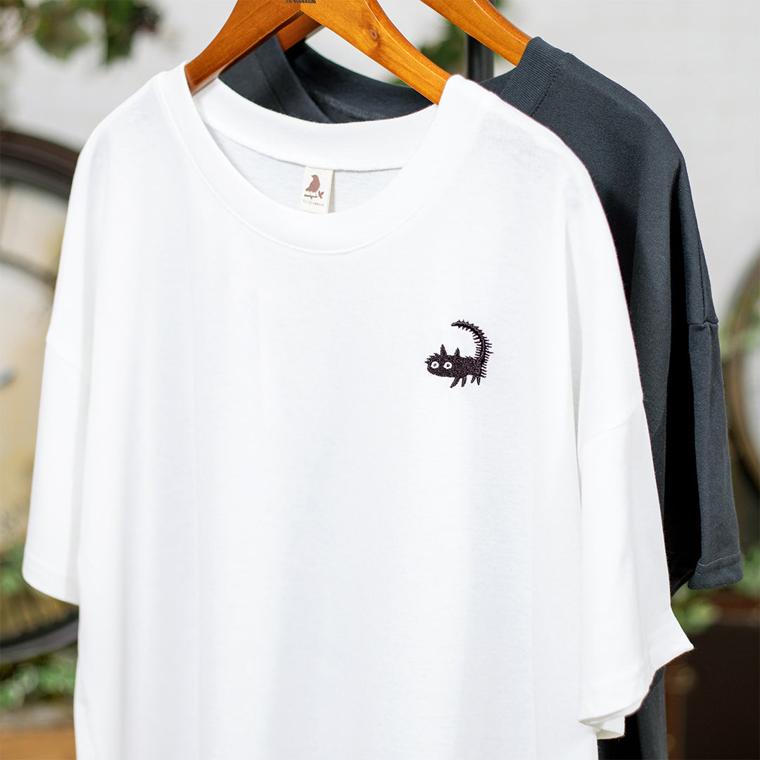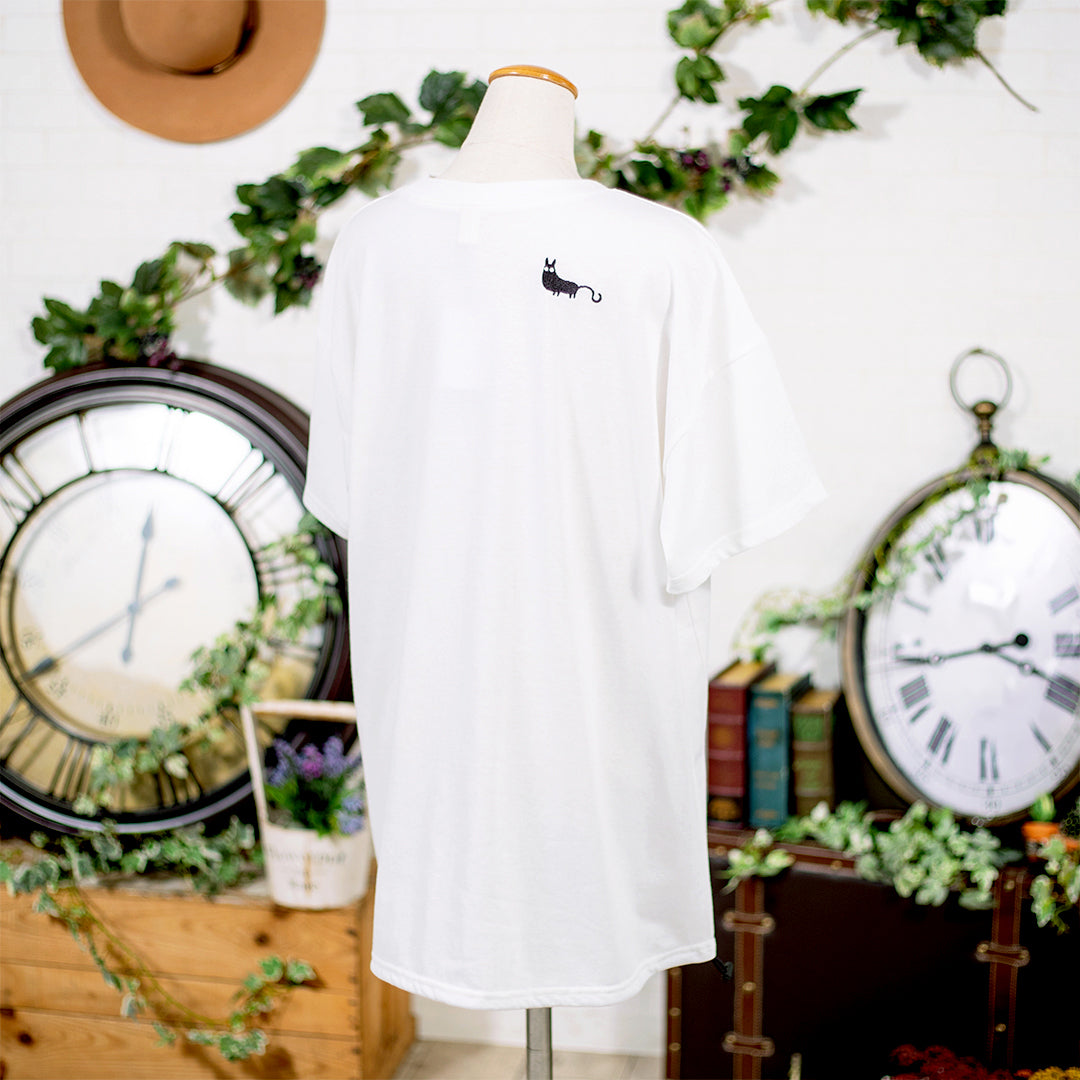 胸元と後ろ肩にあしらわれた、さりげない猫のワンポイント刺繍が、