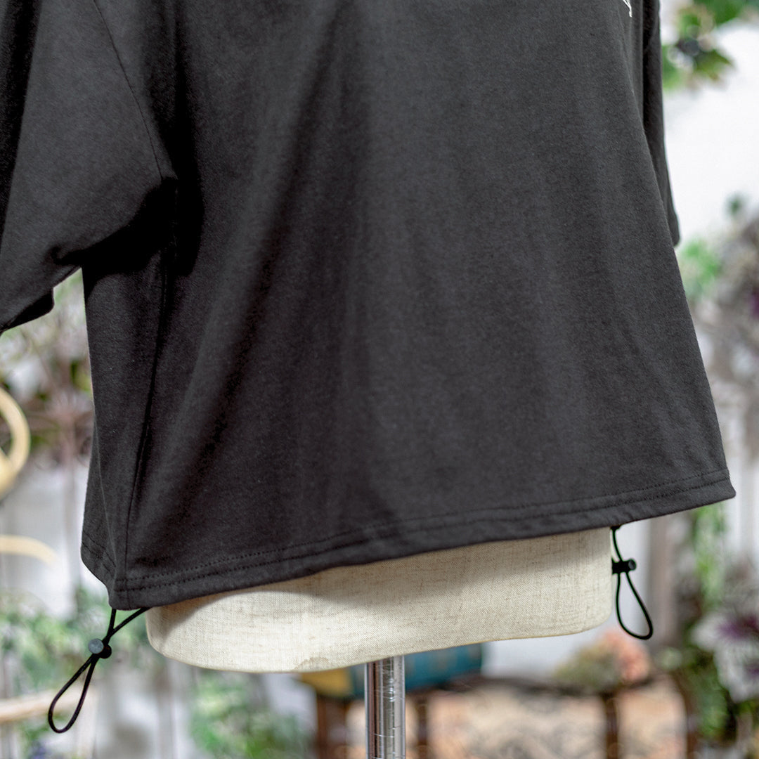 裾には調整可能なドロストコード付き。そのままストンと着るのも良し、キュッと絞って丸みのあるバルーンシルエットを楽しむのも良し。その日の気分でニュアンスを変えられます。