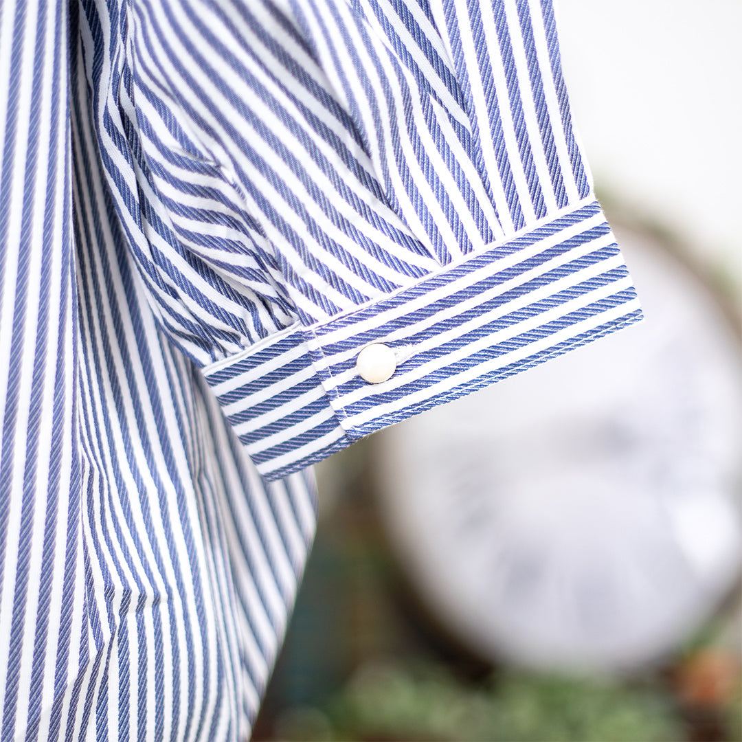 縦のラインを強調する細ストライプが、全体をシャープな印象に。